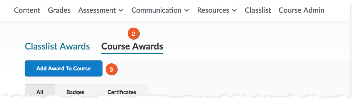 - In your course shell, click on Assessment > Awards in the top navigation.
