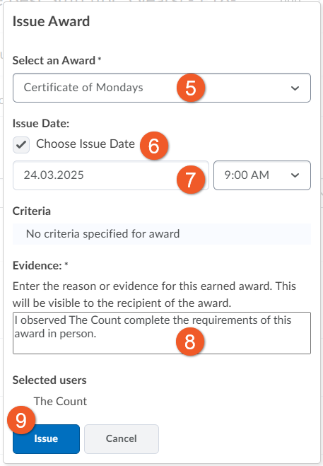 6. The default date and time will be "now", so if you want the award to have a different issue date, select the Choose Issue Date checkbox.