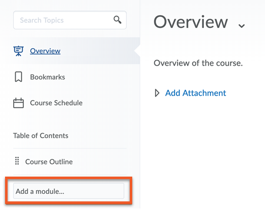 Access the Content tab in your D2L Brightspace course shell. Add a module to the left-hand navigation bar by clicking Add a module… and give it a name.