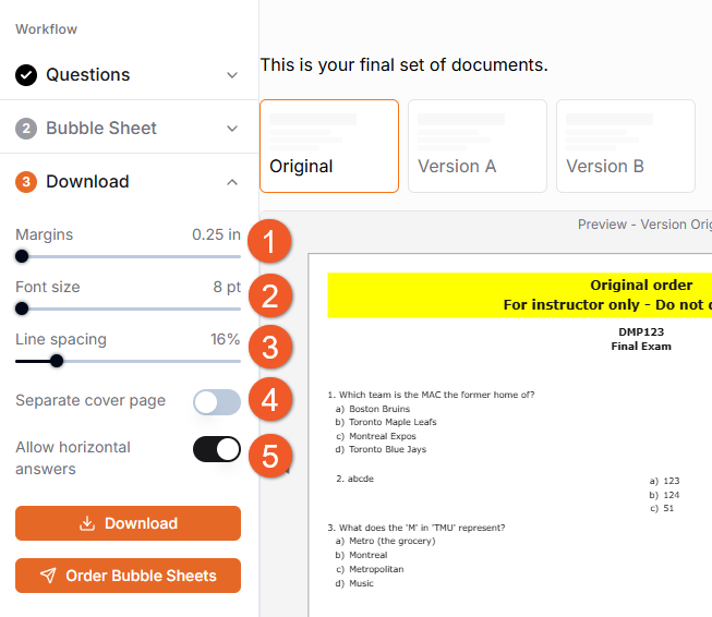 Download: Save a folder of your assessments for printing on your own. Note that only the question sheets are eligible to be submitted to TMU’s Exam Duplicating Form – the bubble response sheets are not.