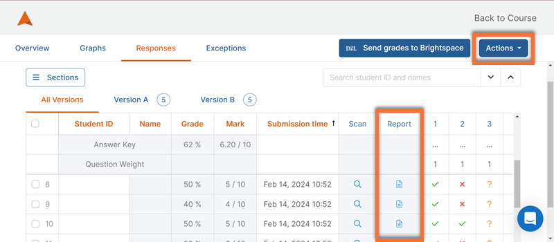 Select the icon in the “Reports” column to view a scan of a student’s response with grading annotations.
