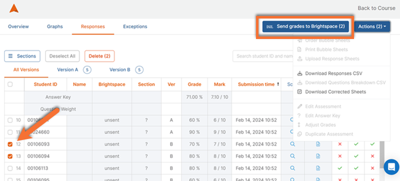 You can also send grades for individual students by navigating to the "Responses" tab and selecting individual students using the left column, before clicking Send Grades to Brightspace.