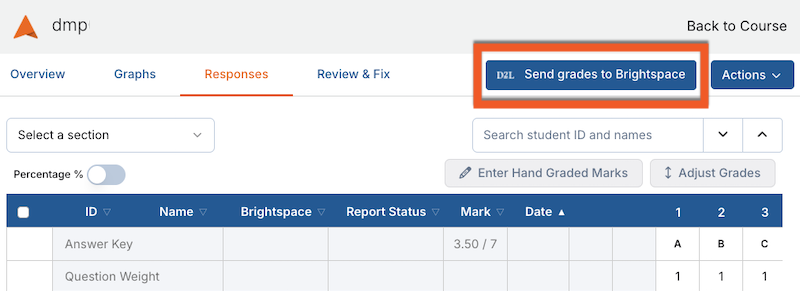 When you are ready to export the grades to your D2L Brightspace course shell, click Send Grades to Brightspace in the top right corner any "Results" page to send grades for all students.
