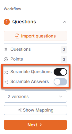 Use the panel to the left of the screen to randomize the order of your questions or answers. If you choose to scramble your content, you will be prompted to specify how many versions of the assessment you wish to generate.