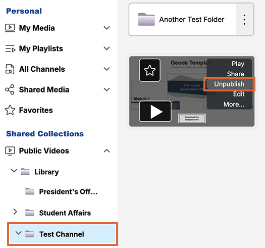 Media can be unpublished from a Media Channel so that it is no longer visible to viewers. The content itself is not deleted; it remains in the content owner’s My Media collection.