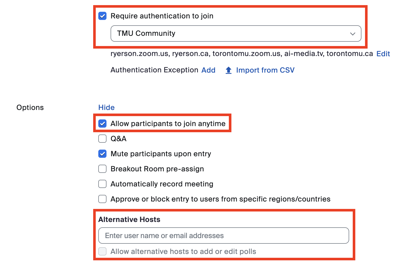 For external attendees, you can pre-select an authentication exception option. Invited guests will then be able to join your session without needing to authenticate their Zoom account with the "TMU Community" authentication profile.