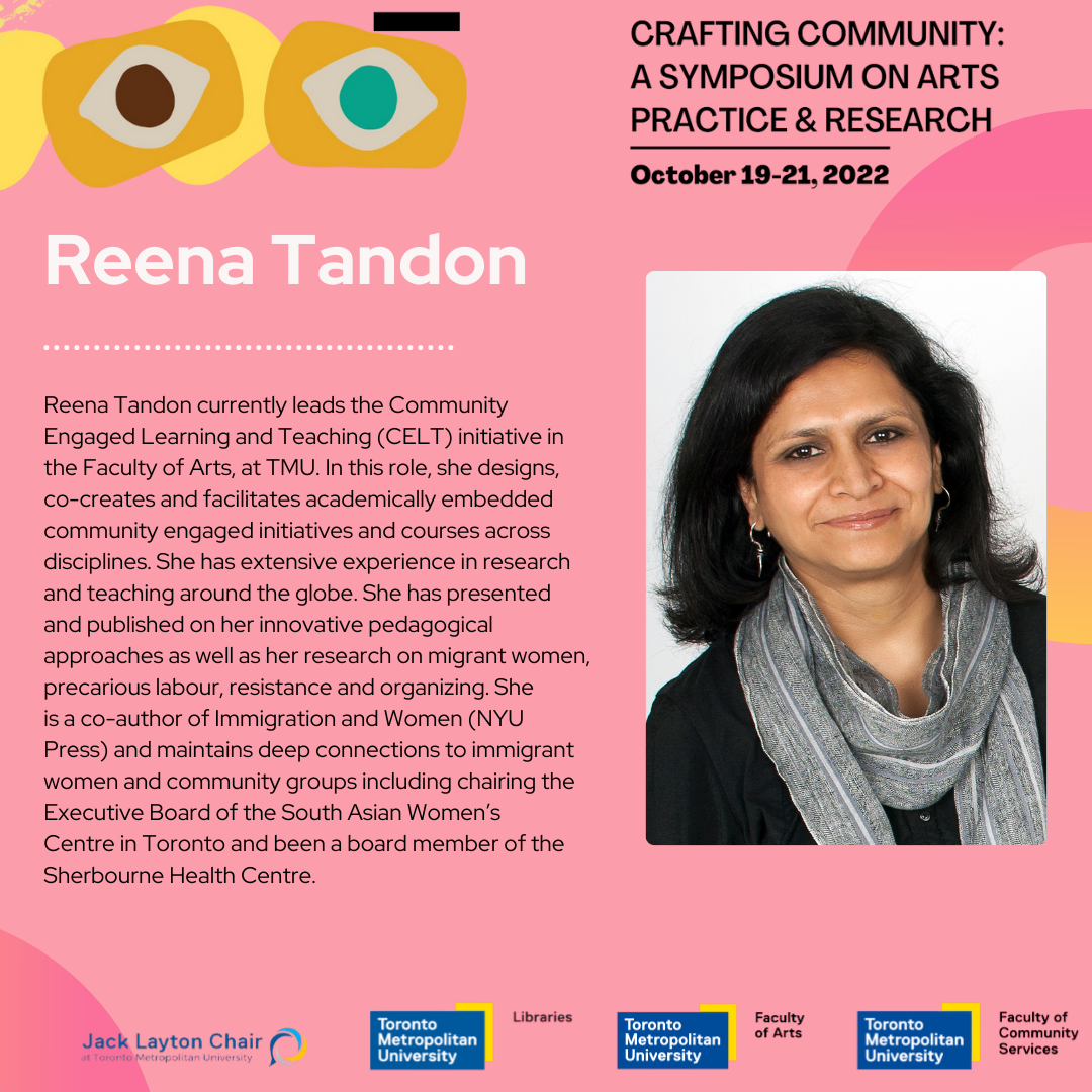 Reena Tandon currently leads the Community Engaged Learning and Teaching (CELT) program (opens in new window) in the Faculty of Arts, at TMU. In this role, she designs, co-creates and facilitates academically embedded community engaged initiatives and courses across disciplines. She draws on her extensive experience in research, teaching and consulting around the globe. She has presented and published on innovative pedagogical approaches as well as her research on migrant women, precarious labour, resistance and organizing. She is a co-author of Immigration and Women (NYU Press) (external link, opens in new window) and maintains deep connections to immigrant women and community groups including chairing the Executive Board of the South Asian Women’s Centre in Toronto and been a board member of the Sherbourne Health Centre (external link, opens in new window) . This project builds on her on-going collaborations with educators, students and practitioners across Canada to center the significance of engaged learning, teaching and research, and transformative pedagogical approaches for democratic and civic engagement within higher education.