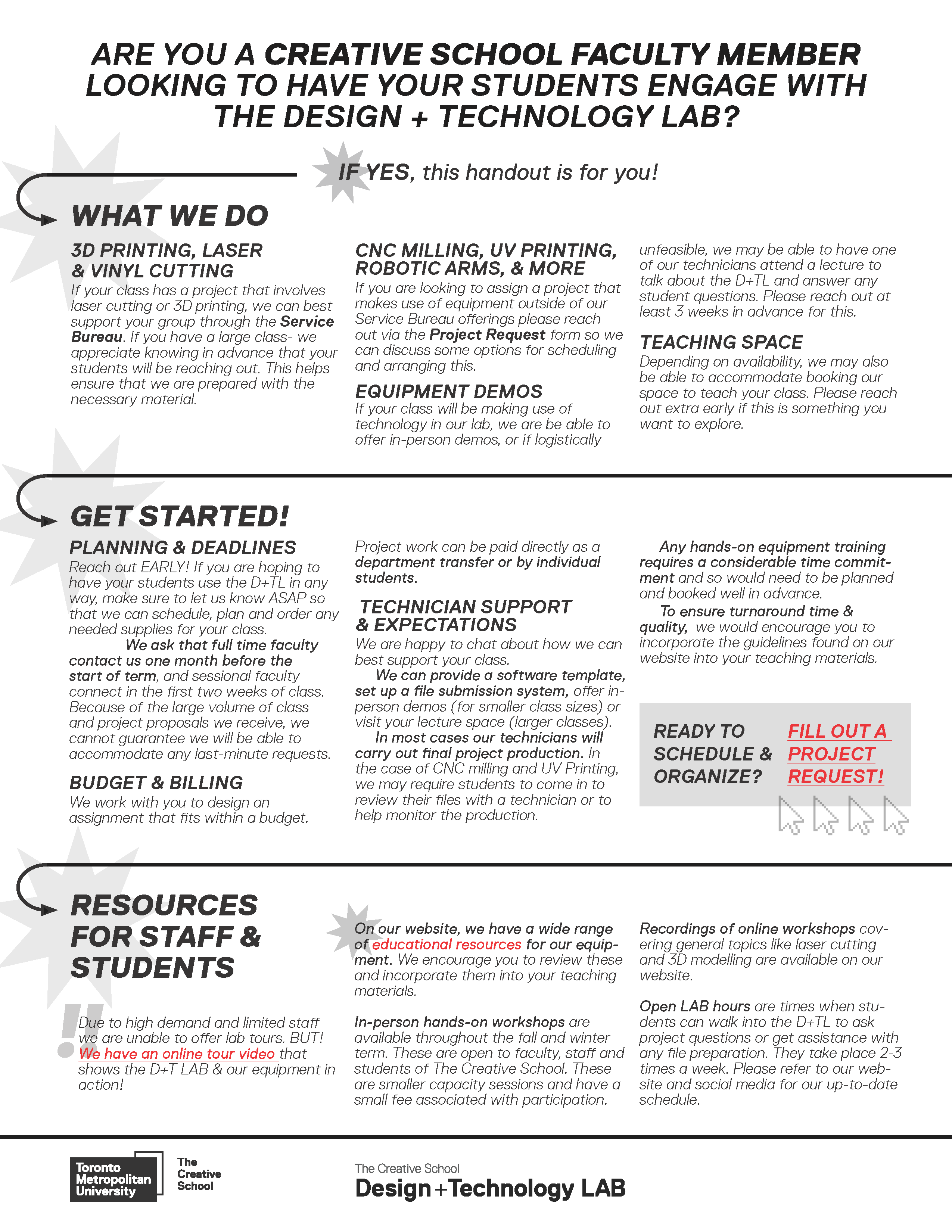 Whether you are a Creative School faculty member hoping to incorporate creative technology into your syllabus or you are a Creative School student looking to work with equipment in the D+T LAB, we ask that you please submit a project request form.