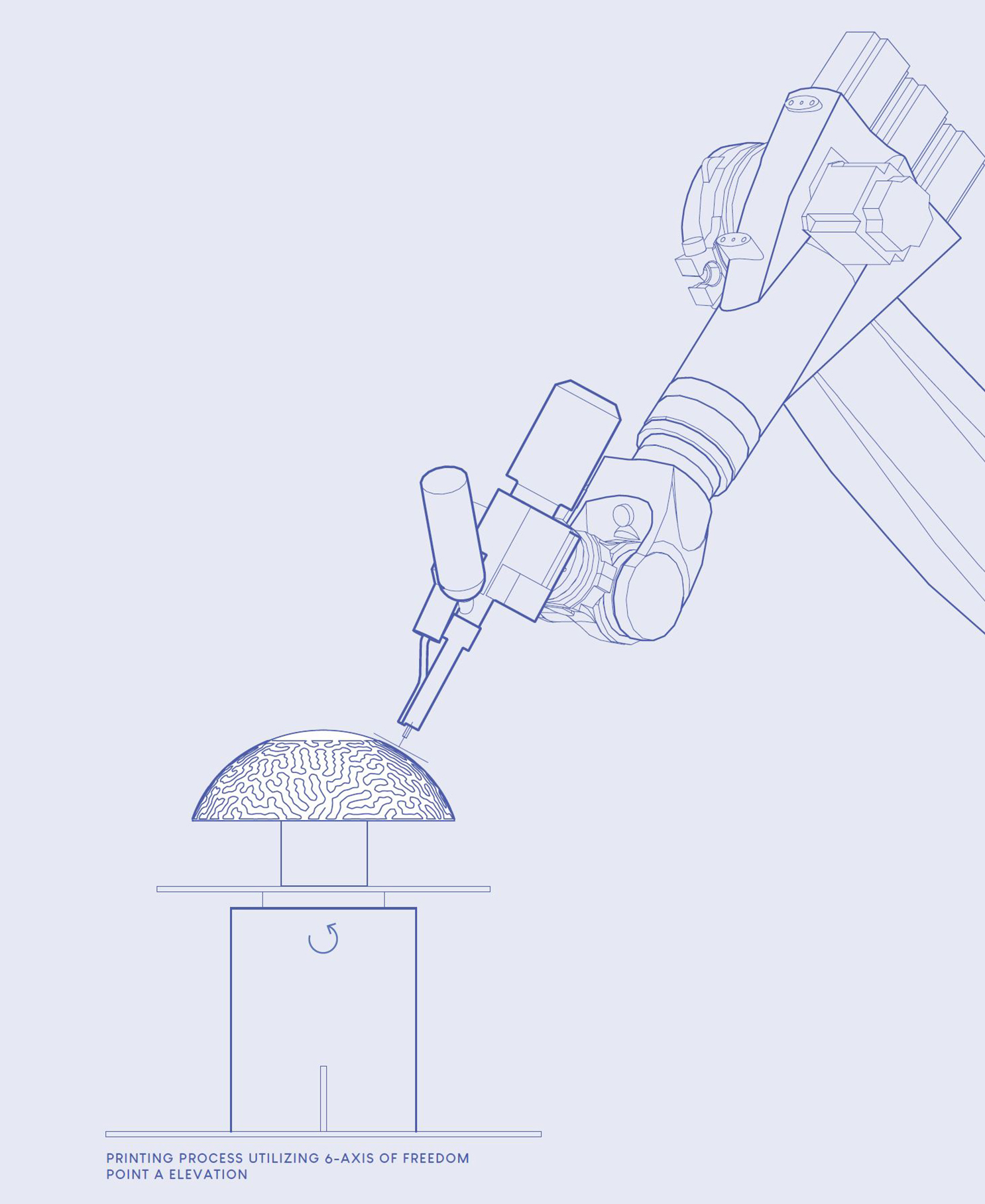 The research will take the approach of utilizing 8-Axis KUKA PRC 150 Robotic 3D Printing to explore and fabricate the patterning index of Reaction Diffusion Theory on to a domed substrate. This experimentational study will involve formwork development, pattern simulation-formation and pushing the boundaries of the hardware technology to effectivelyachieve a successful variety of patterns of prints on a substrate.