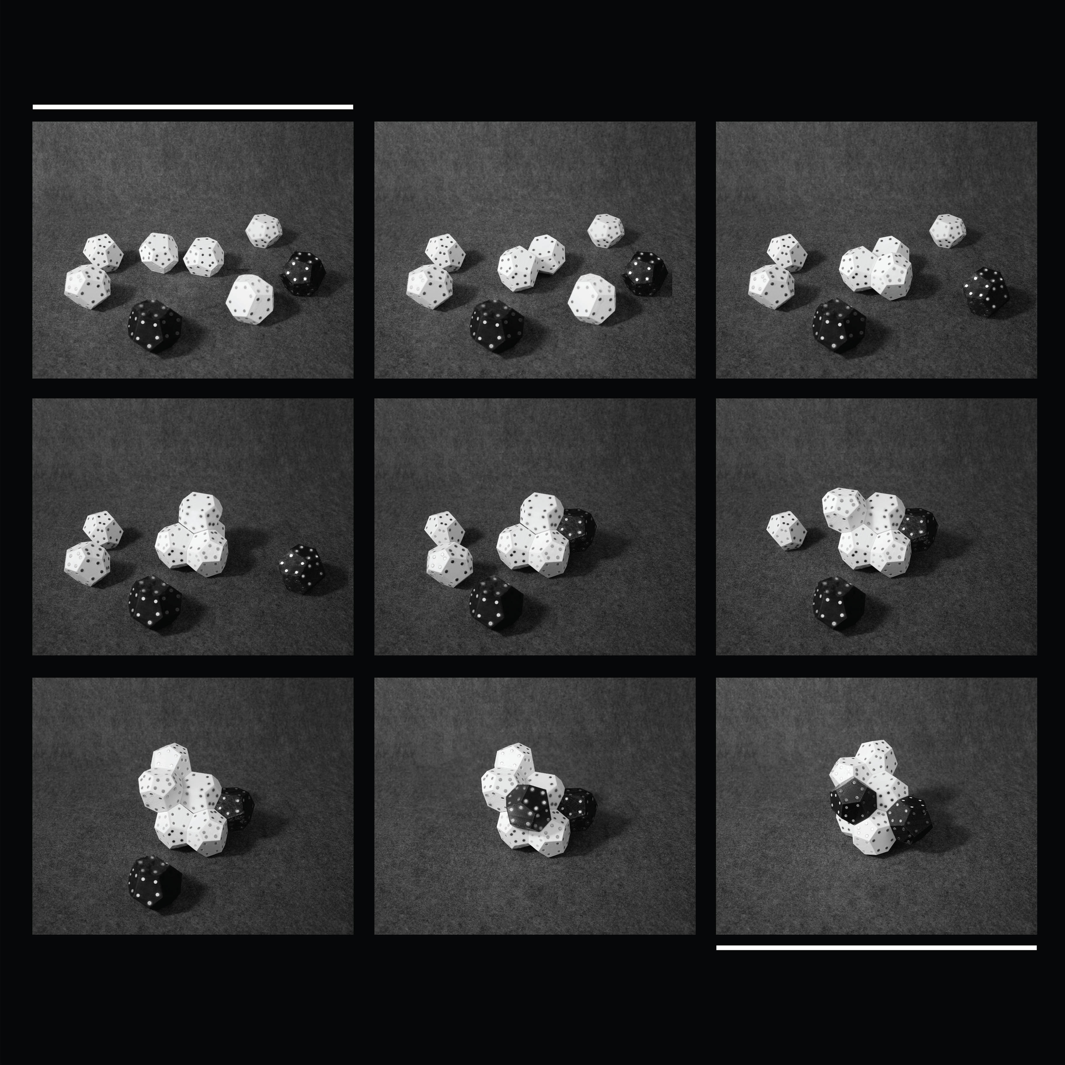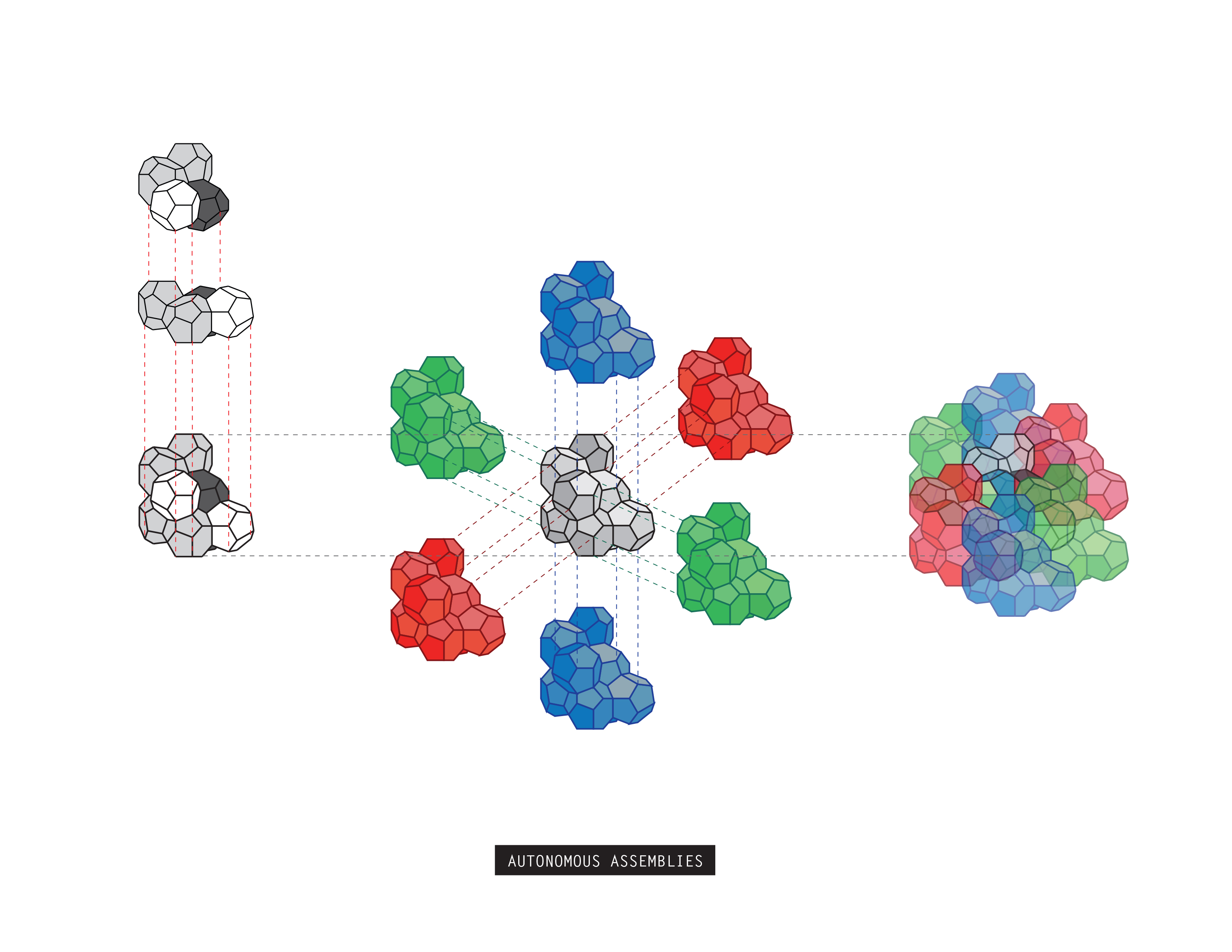 Although experimental technologies and computational methods such as robotic construction and digital simulations have afforded unprecedented capabilities to realize complex designs, we are still faced with the challenges of predictability, control, and authorship. While active self-assembly methods require materials to undergo specific property changes, this project focuses on passive self-assembly techniques to challenge form-finding behavior. Looking to biological precedents such as stigmergic collaboration and swarm intelligence, the issue of approximation and uncertain outcomes remain. Hence, the physical geometry of individual units is used as an opportunity to introduce modular control. Unlike robotic construction where local interactions and material properties are physically stable, automation for assembly is not centralized and is instead reliant on an algorithmic approach – where an intrinsic logic to micro-level units can be tuned and authored to affect the macro-level outcome. This enables system components to interact based on a subsystem rooted in spatial boundaries and polygonal alignment. Autonomous Assemblies is an ongoing research model for atypical construction processes - taking a speculative discourse on the application of self-assembly in the fields of materials and construction. In addition to examining logic systems and geometry, formation methods that question ways of equilibrating aggregations can lead to the development of increasingly robust systems for inquiry and assembly. As we look towards information-based approaches to manipulate resultant transformations, behavioral characteristics are undoubtedly shaped by both internal tendencies of individual units and external reactions of the overall assembly to environmental conditions.