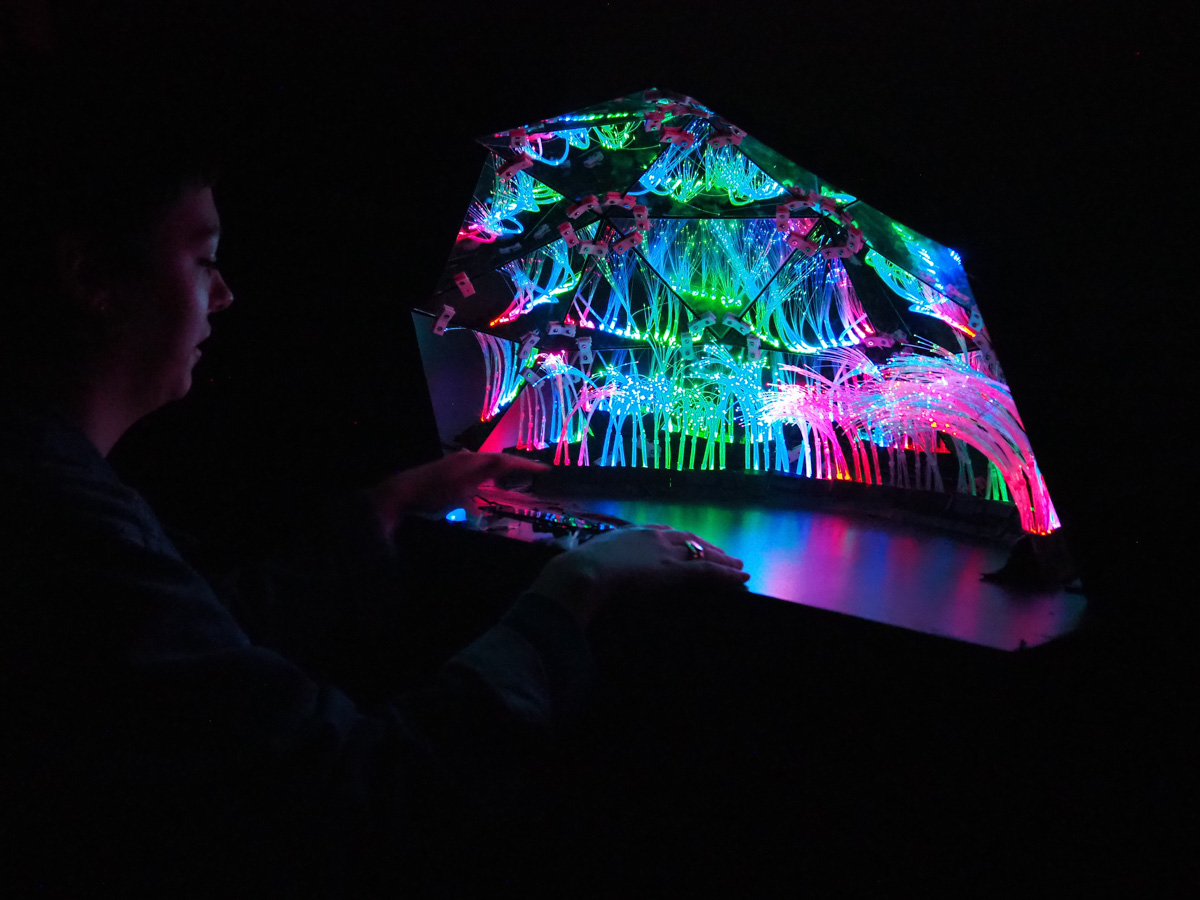 Fabricated with fiber optic LEDs intricately arranged to mimic delicate patterns observed in nature, Biolumina extends as an embodiment of the user's creative impulse. The incorporation of fragmented mirrors enhances the immersive quality, reflecting and refracting the user's controlled illumination into a mesmerizing kaleidoscopic dance. Biolumina evolves into a dynamic, living canvas, mirroring the observer's gestures and offering an immersive journey into the captivating beauty of meticulously controlled chemical reactions.