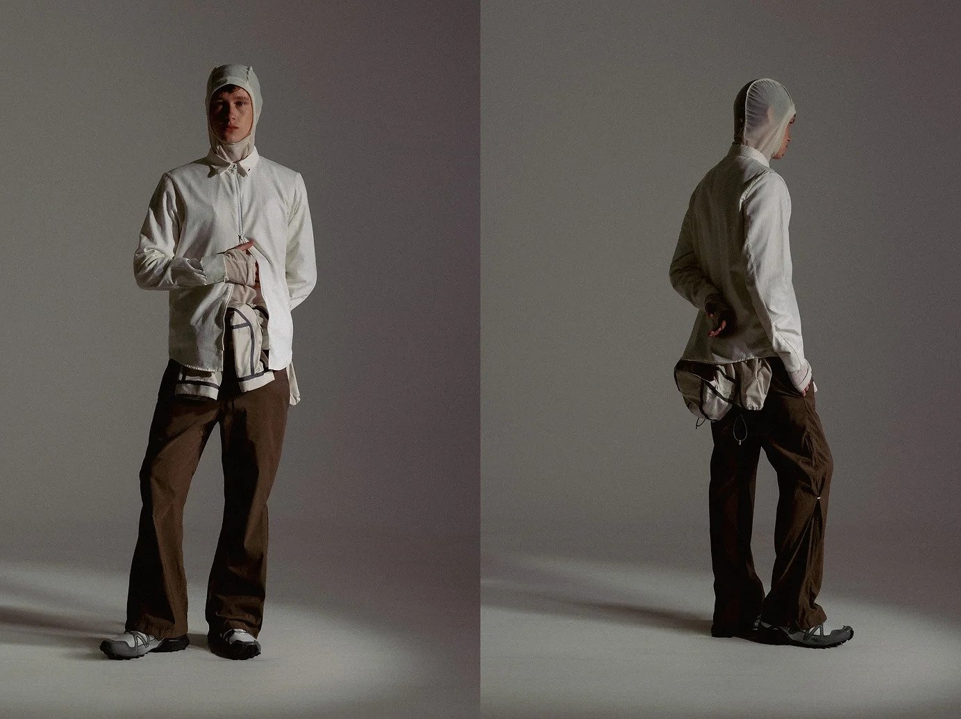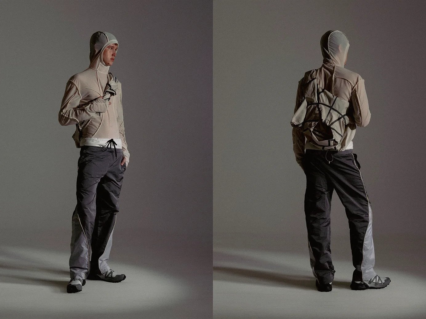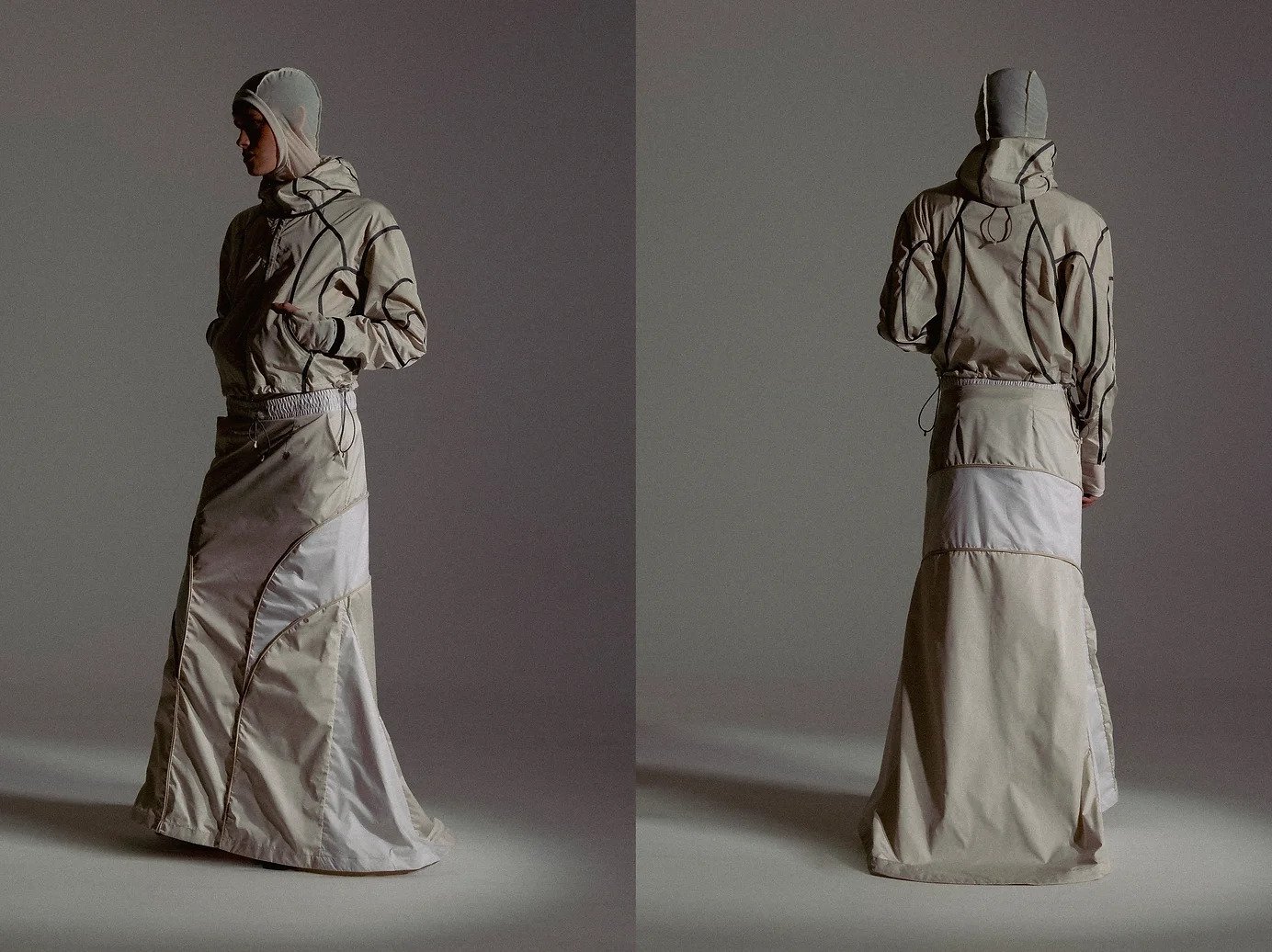 Referencing outdoor apparel constructions, the garments consist of complex panellings for an engineered fit according to the layering system. The notions of security and vulnerability are seen through technical and transparent textiles such as ripstop nylons and noseeum mesh, furthering the sense of protection while being exposed. Loose silhouettes are paired with tight, structured garments, thus exemplifying the idea of disorientation. Monochromatic colours capture the essence of isolation experienced in the wilderness, representing the feelings of alienation. The conflicted emotions evoked in this collection leave viewers feeling uneasy, and clouded with their thoughts and emotions.