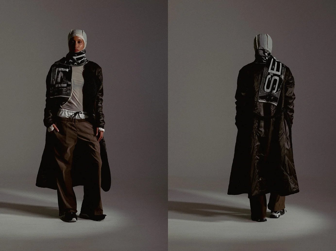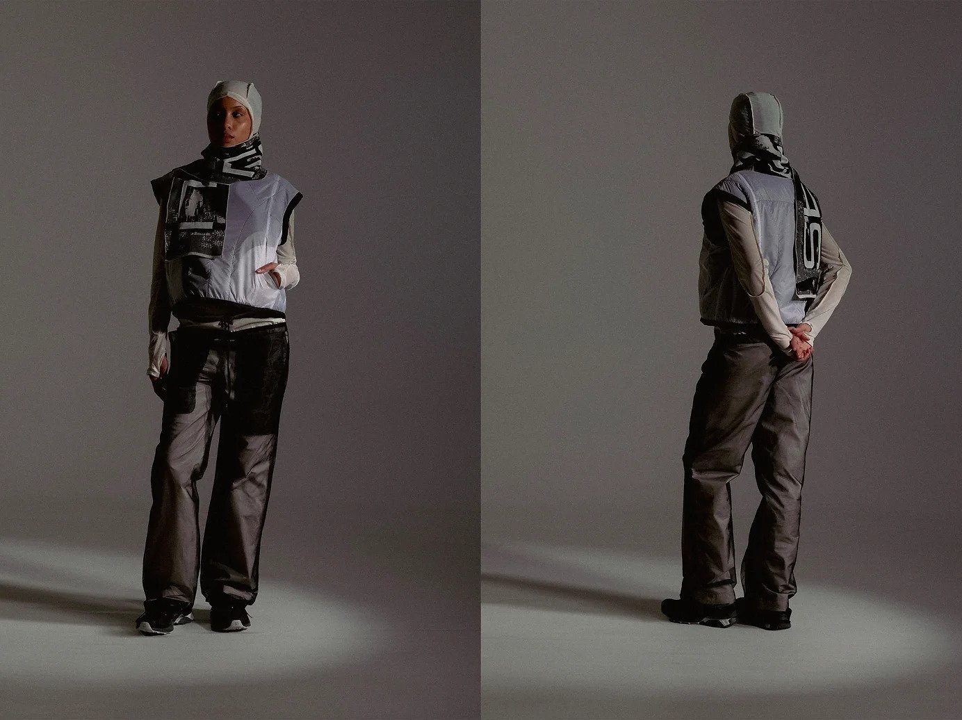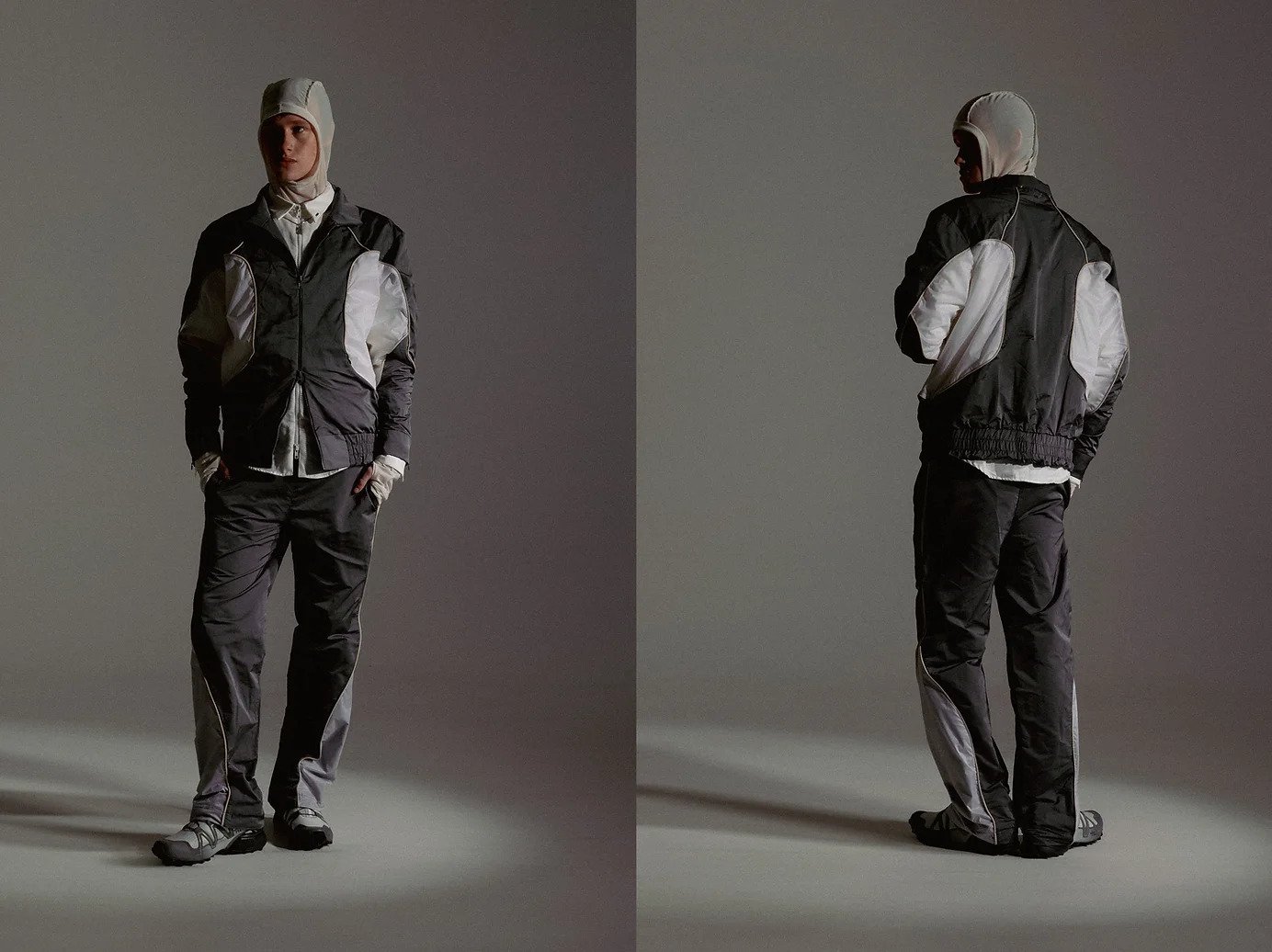 Referencing outdoor apparel constructions, the garments consist of complex panellings for an engineered fit according to the layering system. The notions of security and vulnerability are seen through technical and transparent textiles such as ripstop nylons and noseeum mesh, furthering the sense of protection while being exposed. Loose silhouettes are paired with tight, structured garments, thus exemplifying the idea of disorientation. Monochromatic colours capture the essence of isolation experienced in the wilderness, representing the feelings of alienation. The conflicted emotions evoked in this collection leave viewers feeling uneasy, and clouded with their thoughts and emotions.
