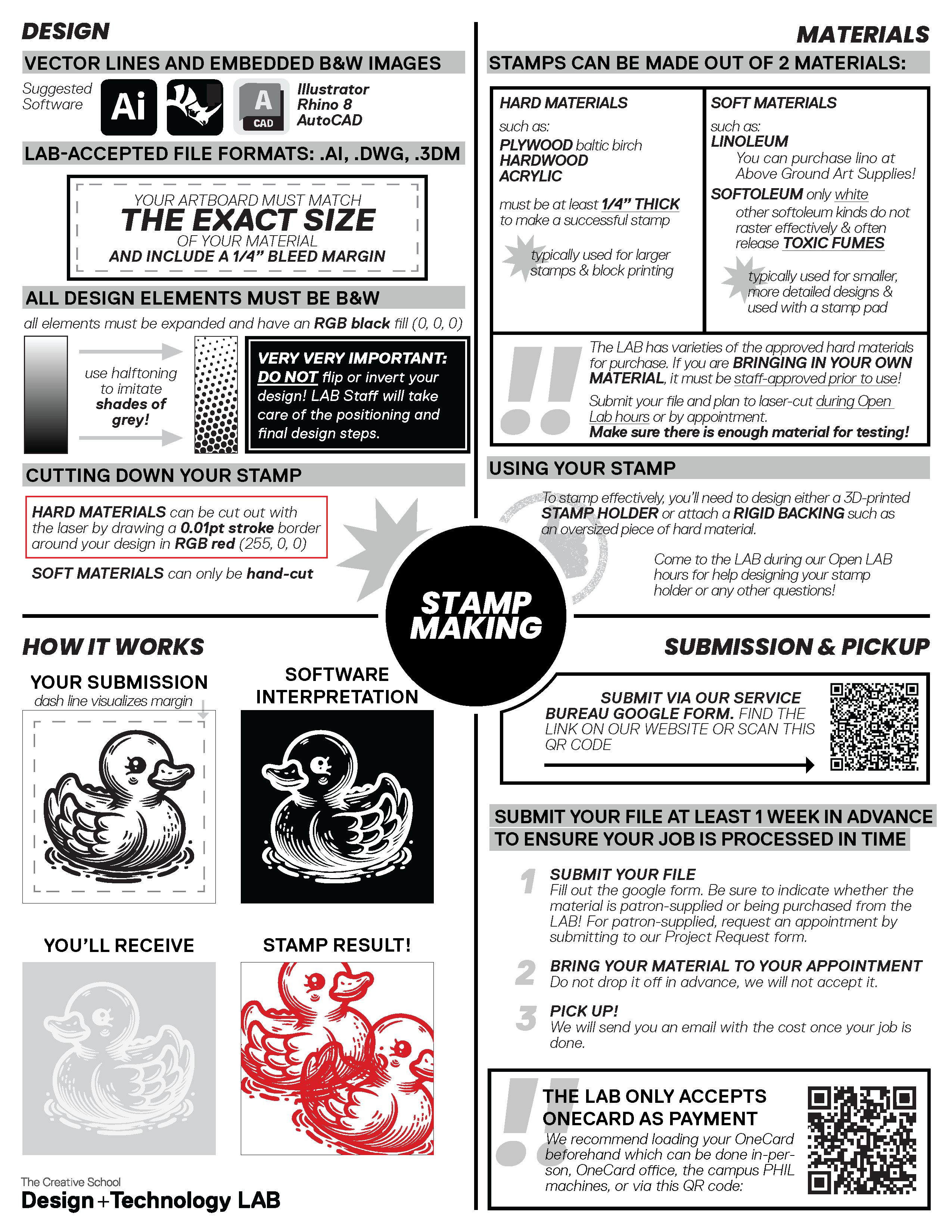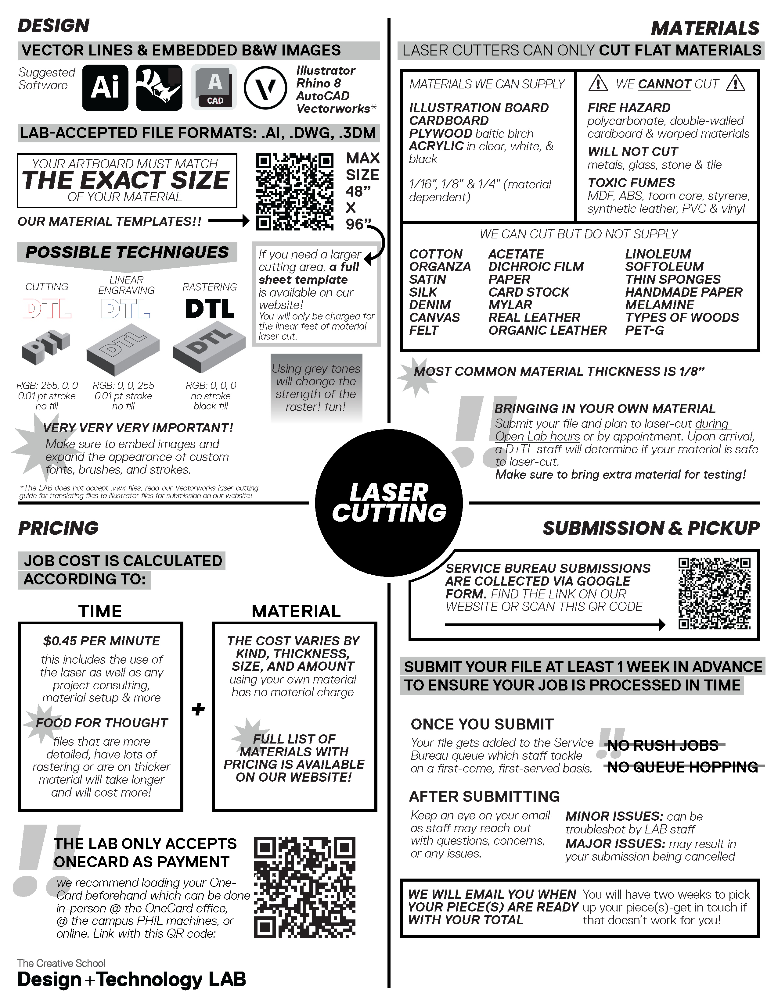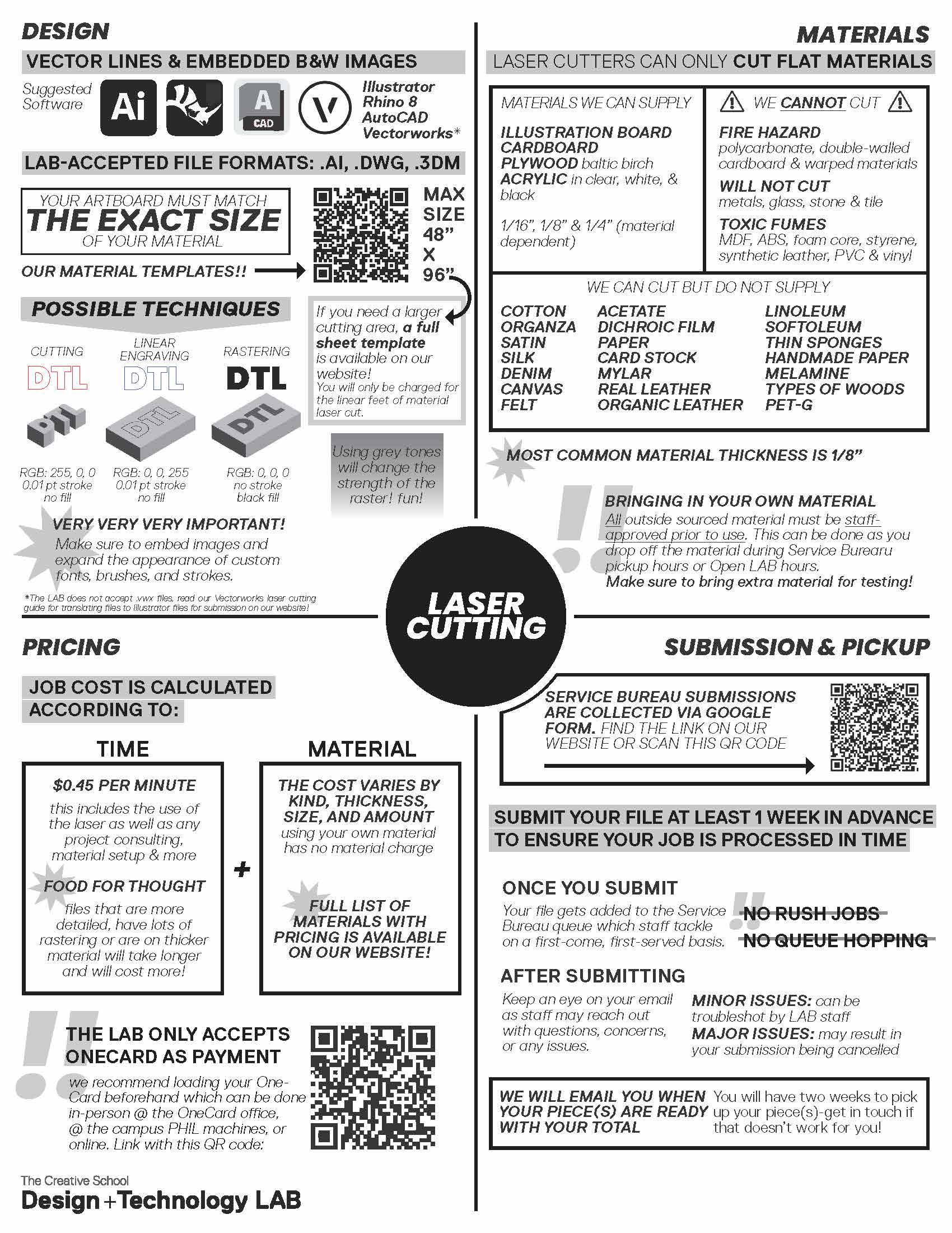 All laser cutting for students, staff and faculty of The Creative School is charged at $0.45/minute.