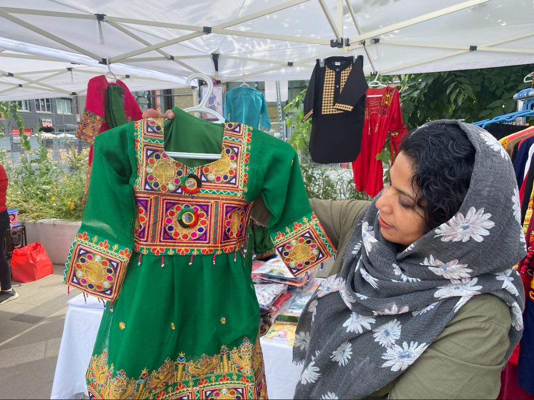 Gulshan Mosleh, founder of Paroon Fashion, holds up a traditional Afghan outfit for a boy at the market Riverside Common Park in Toronto.