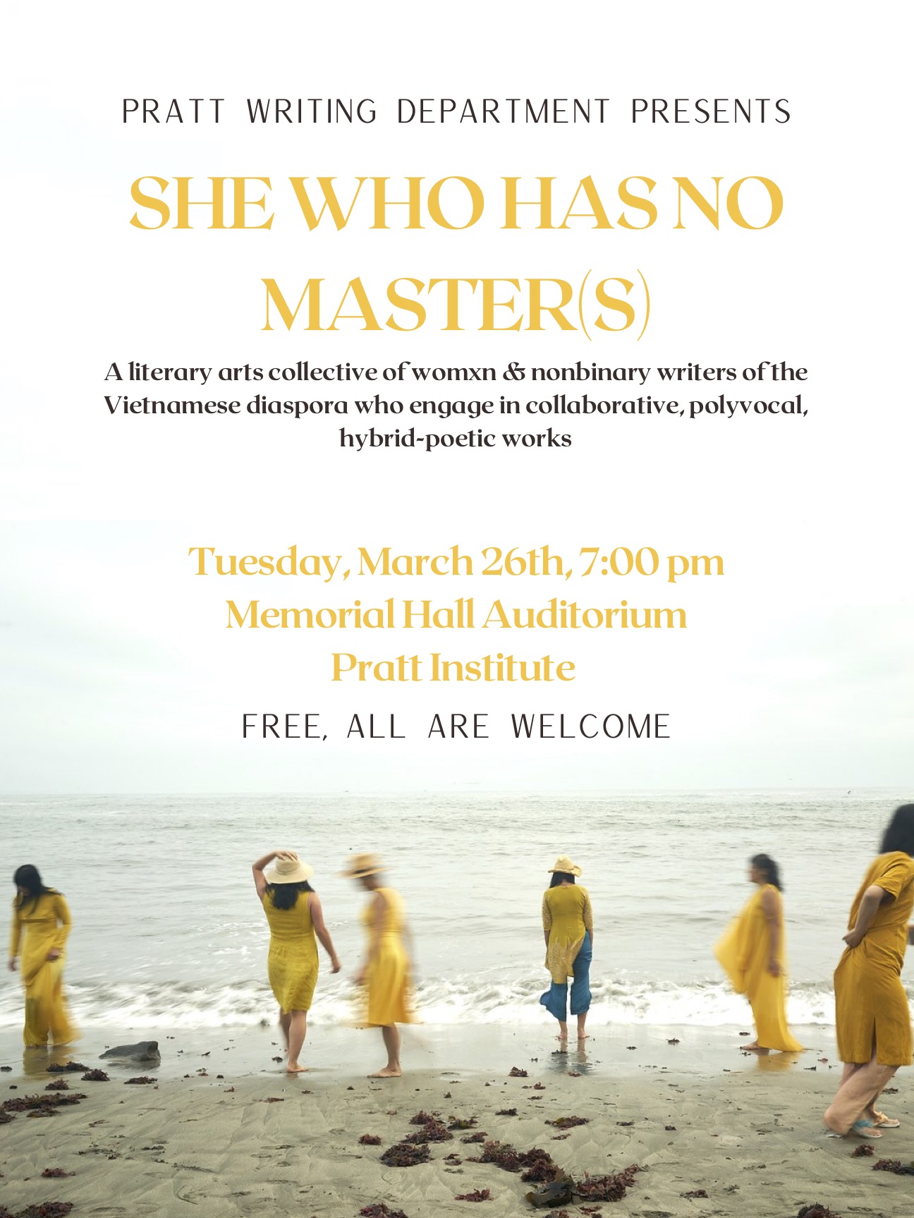 On Tuesday March 26 at 7 PM, She Who Has No Masters will present work from their Yellow Echoes series in Pratt's Institute's Memorial Hall. A collective of womxn and nonbinary writers of the Vietnamese diaspora, She Who Has No Masters engages in collaborative, polyvocal, and hybrid-poetic works to enact a politics of connection across diasporic boundaries. Their presentation is part of Hoa Nguyen's presence as Writer at Large, a position the Pratt Institute Writing Program offers yearly to a writer whose multidimensional practice can help students come to new questions of their own while engaging the visitor writer's ranging, shiftful work. Hoa Nguyen been an integral member of She Who Has No Masters since 2017.