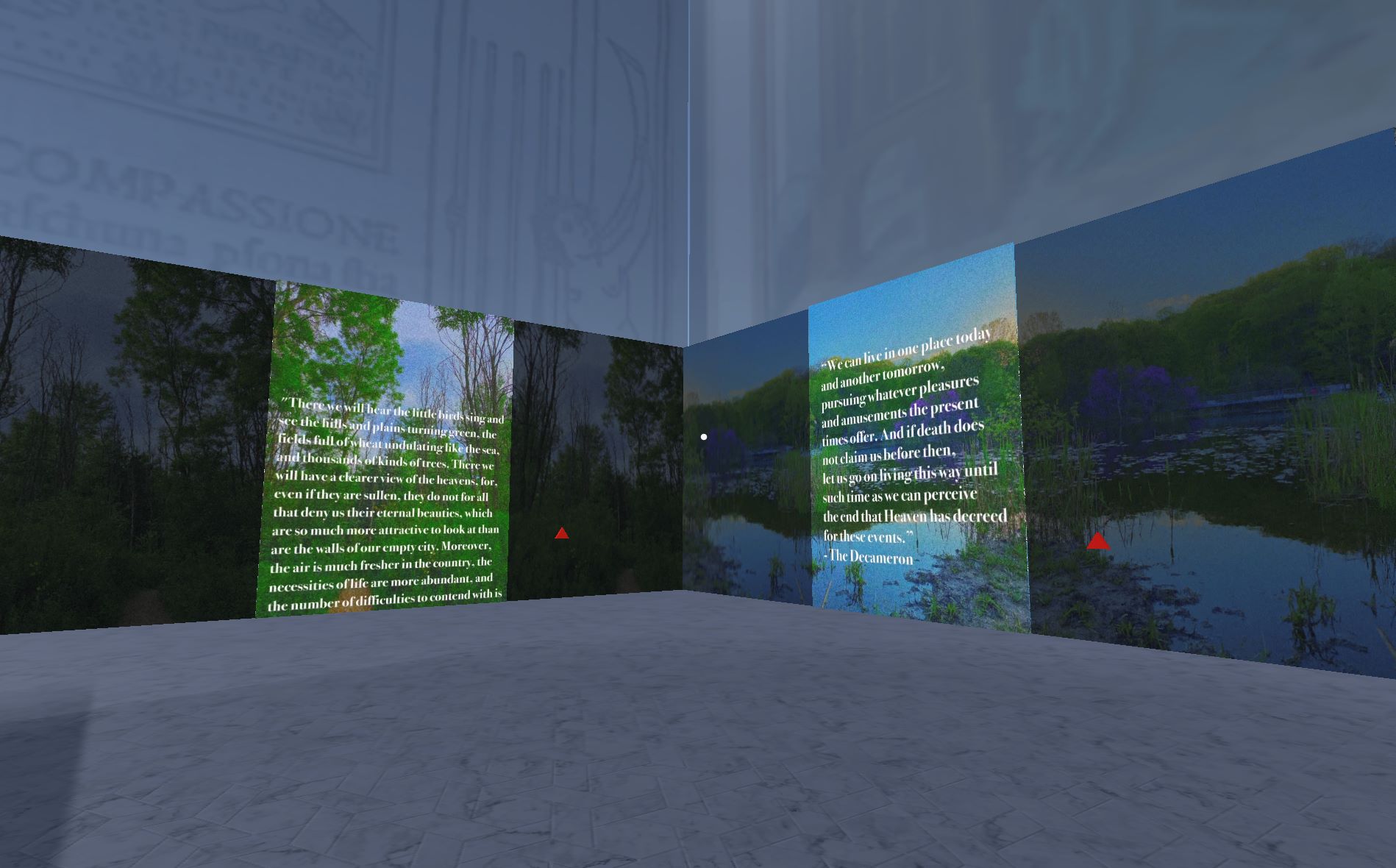 The Decameron 2.0 is an interactive digital storytelling world created in WebGL, designed in dialogue with Giovanni Boccaccio’s medieval frame narrative set in Florence during the Great Plague (1353). Boccaccio’s The Decameron offered literature a model for uniting heterogenous stories inside one frame narrative. In the book, ten storytellers retreat from a plague-swept city to walled gardens where they entertain and distract each other, each telling the group one story per day for ten days. This work of literature stood apart from literary works before and after because of its representations of strong, complex women storytellers. “It seemed logical, as the world was shutting down in March of 2020 and these nine women started to meet over Zoom to tell stories to each other for us to return to and really think about this source text,” says Tschofen.
