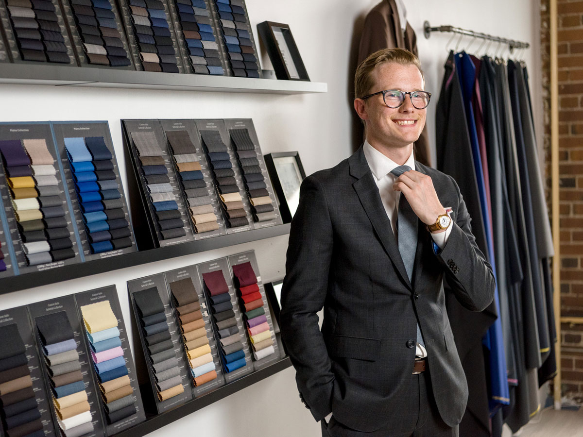 Noah Parker, a business management student (graduating in October) and creative director of the menswear startup Four Fifty Five (external link) . The business, conceived as part of Parker’s entrepreneurship capstone course, specializes in quality, affordable suits and accessories, tailored in a friendly, personal environment. Incubated in the Fashion Zone, (external link) , the business is now located at a boutique-style studio at 90 Ontario Street.