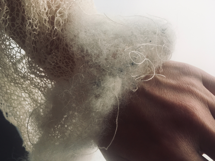 As a researcher, I tell stories through a compound and densely articulated making process. In a sense, I believe describing my work as something that materializes is apropos as my academic arguments are predominantly and most eloquently spoken in intricate yet effusive cloth forms. These forms are webbed together by multiple techniques and treatments— weaving, knitting, crochet, embroidery, and stitching, which are then washed, stained, brushed, printed, and mended. The materials include: mono-filament invisible, mohair, horsehair, and wool yarns, with tulle and organza fabrics, are held in a tenuous balance of construction and deconstruction. With multidisciplinary and non-linear procedures, I reveal my ongoing obsession with the affect emitted by specific body imagery in art and popular culture. As I examine these aestheticized bodies, I engage with theory that speaks to their emotive qualities to gather descriptive vocabulary. The theoretical glossary generated becomes a list of creative prompts to be interpreted in the textile studio where I attempt to craft this affect in my primary language which is experimental cloth
