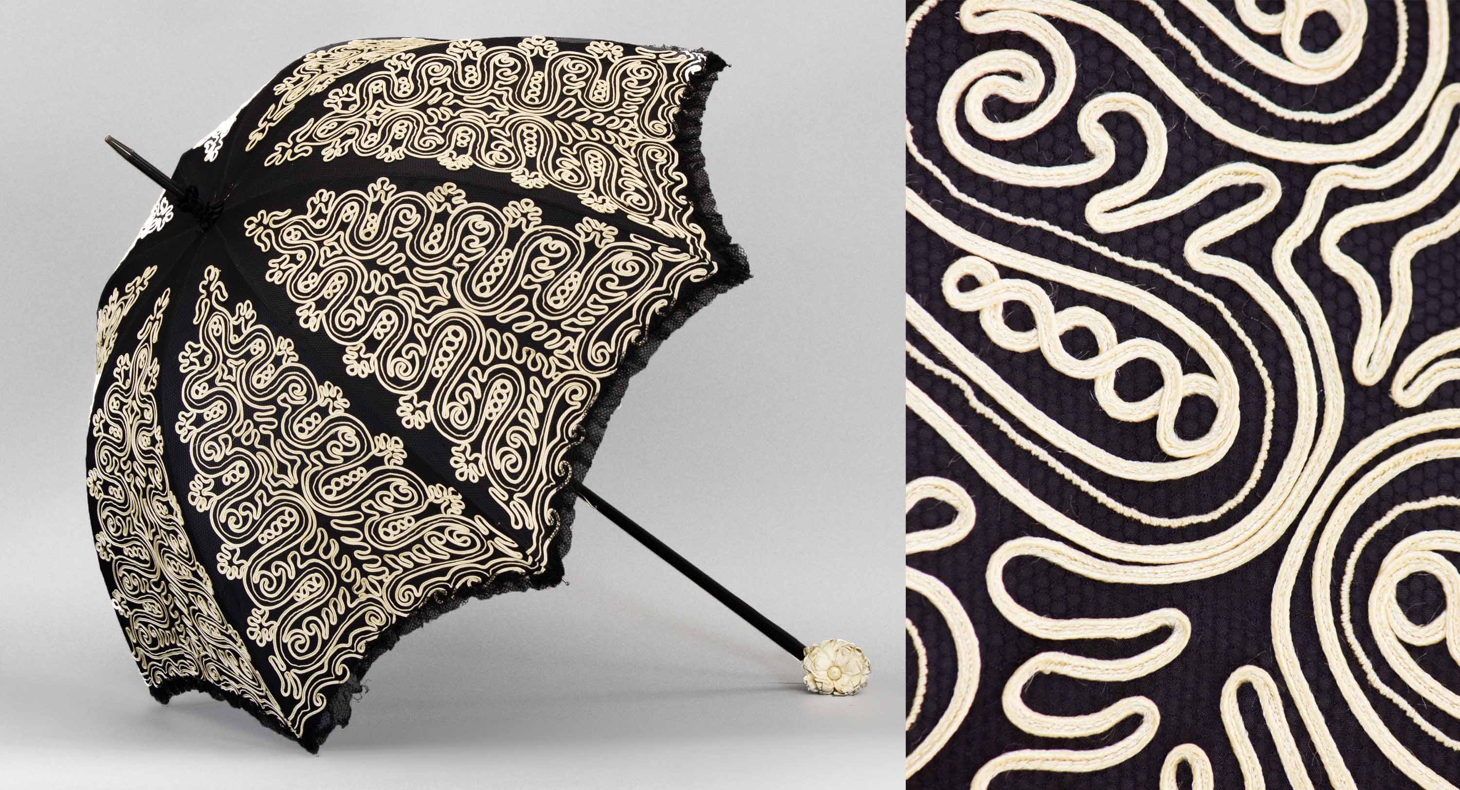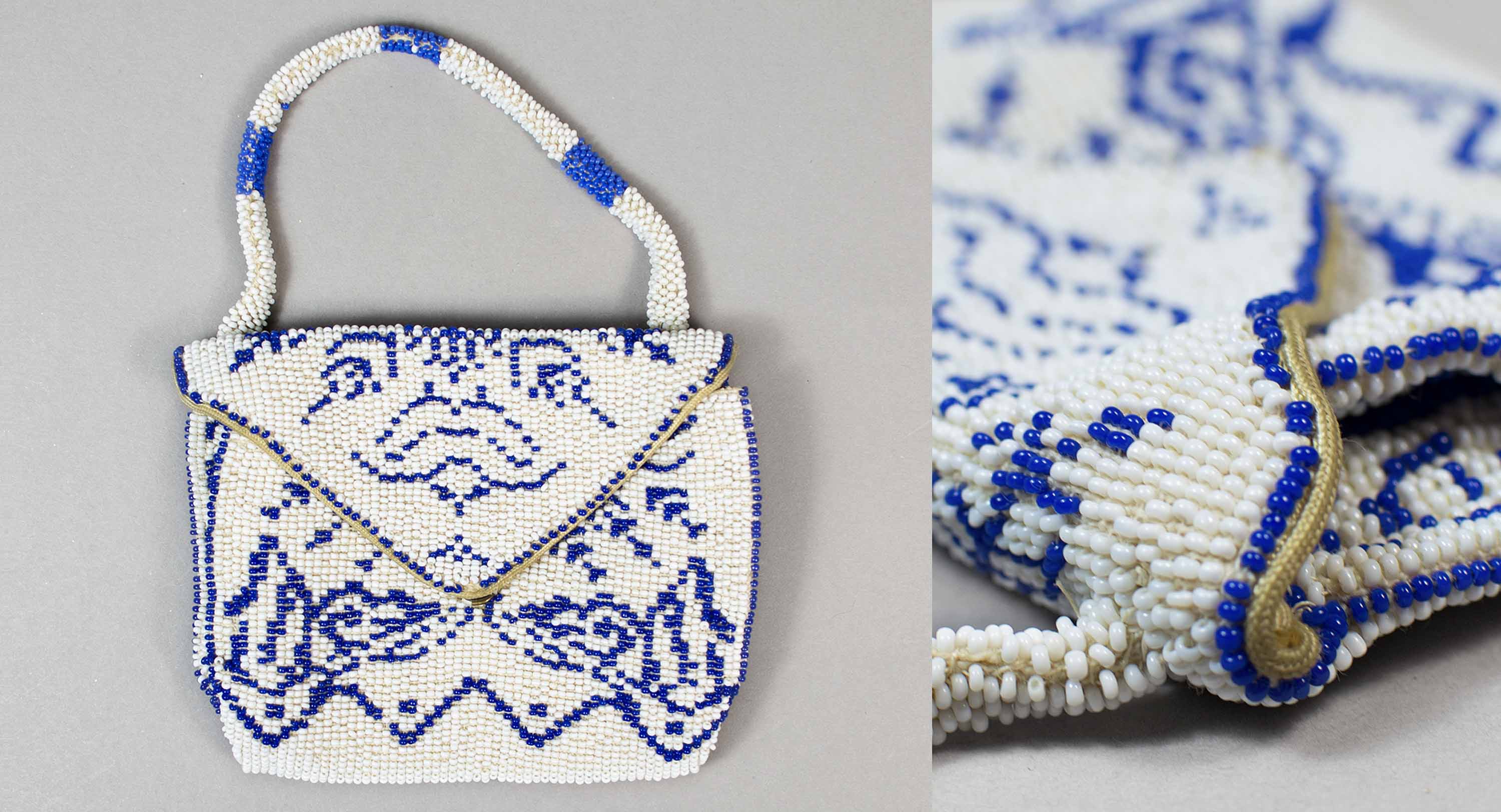Black silk parasol, ca. 1900s, FRC1989.02.001. Men's beaded gauntlet gloves, ca. 1990s, FRC2019.01.003AB. Envelope flap evening purse with white and blue beading, ca. 1930s, FRC2018.04.002.