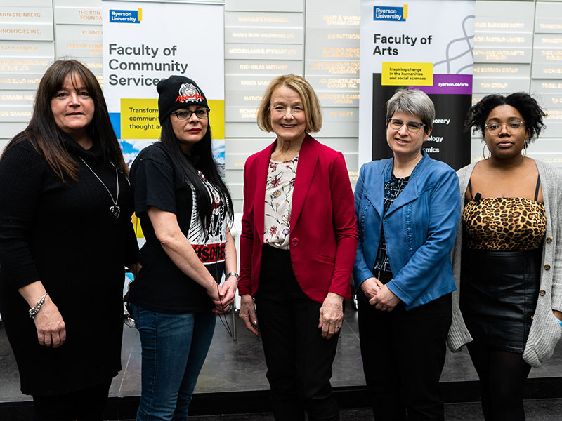 From left: Lynn Lavallée, FCS strategic lead, Indigenous resurgence; Phyllis McKenna, vice-president of equity and campaigns, CESAR and co-founder and current member, Indigenous Students Rising; Peggy Nash, distinguished visiting professor, FA and FCS; Lisa Barnoff, dean, FCS; Pascale Diverlus, communications specialist, educator and activist. Not pictured: Olson Crow, executive of student affairs, Ryerson Indigenous Students' Association and national 2S and transgender constituency rep, Canadian Federation of Students. Photo: Michael Pereira