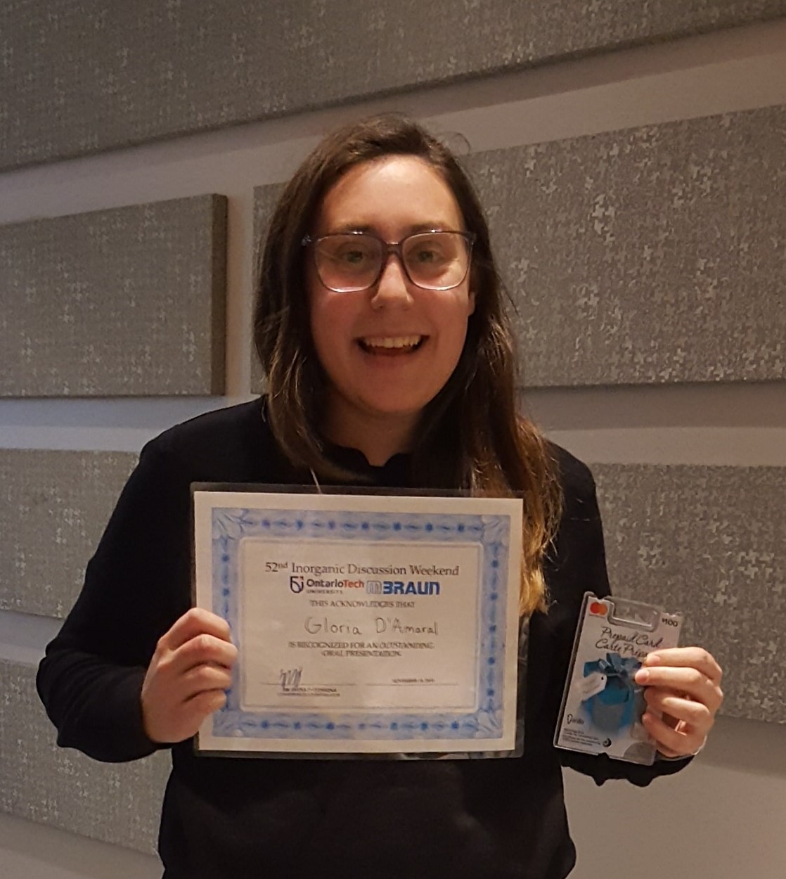 - November 10th, 2019 – Gloria D’Amaral wins an Outstanding Oral Presentation Award at the 52nd Inorganic Discussion Weekend Conference at Ontario Tech University