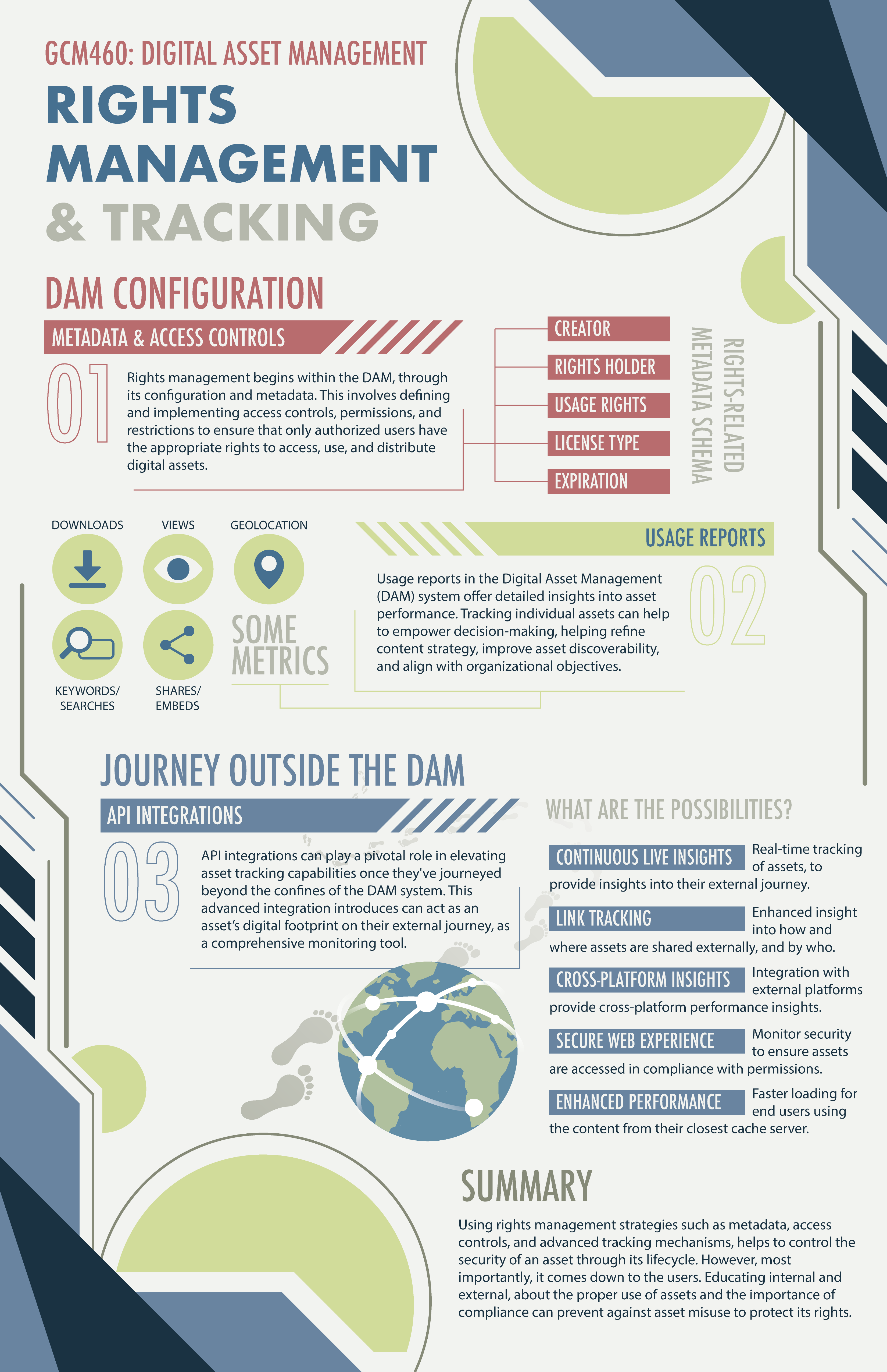 This past fall term I had the privilege of teaching GCM 460 Asset Management in Graphics Communication as a virtual module. We introduced students to the foundations of digital asset management in graphic communications and allowed them to employ their knowledge this semester through a new assignment called the DAM creative, where students selected a sub-topic related to the course and re-introduced it through a creative medium.