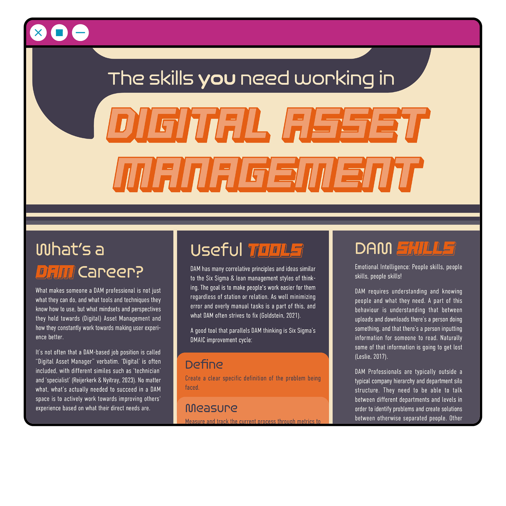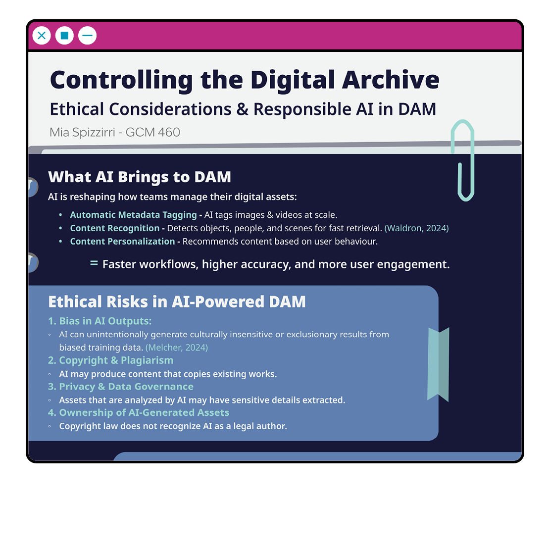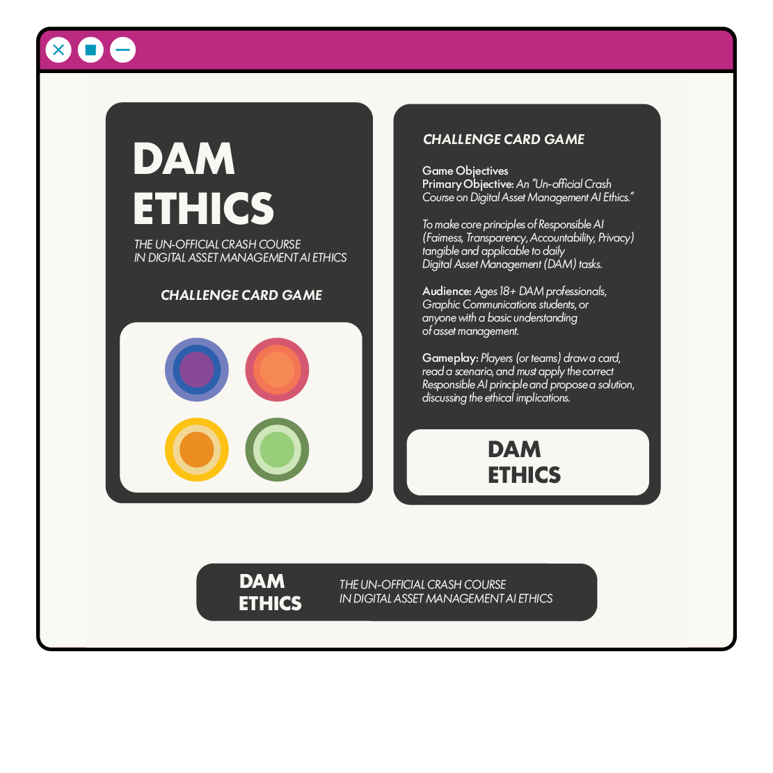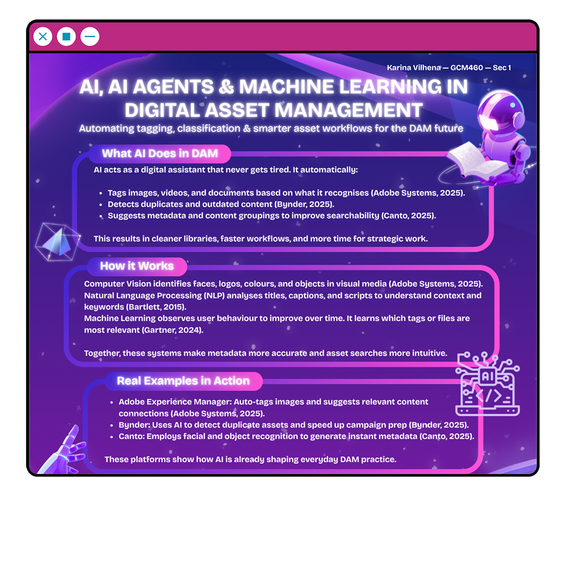 This past fall term I had the privilege of teaching GCM 460 Asset Management in Graphics Communication. We introduced students to the foundations of digital asset management in graphic communications and allowed them to employ their knowledge this semester through an assignment called the DAM creative, in which they selected a sub-topic related to the course and re-introduced it through a creative medium.