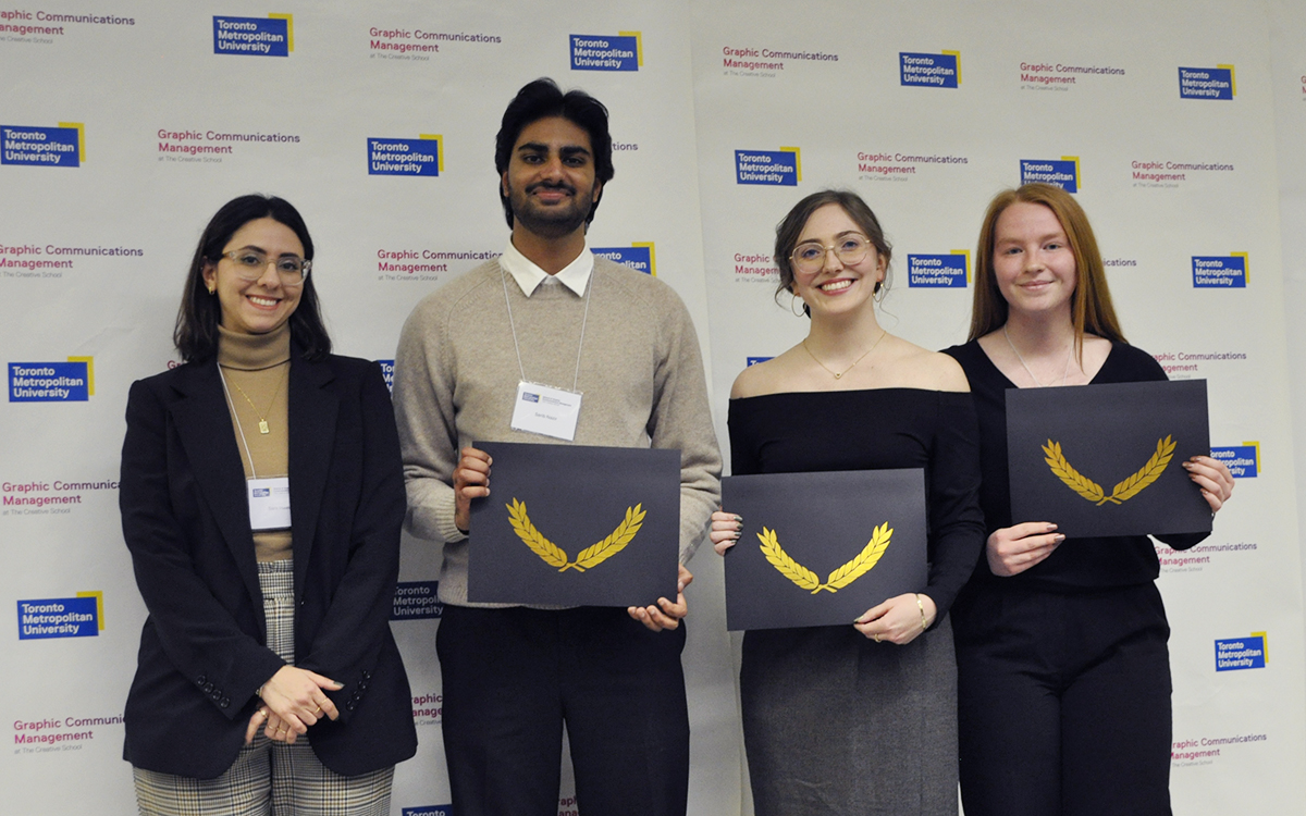 This award is open to all Toronto Metropolitan students enrolled in a School of Graphic Communications Management (GCM) course who used the five-colour capability of the Ricoh C7210 printer, as well as Toronto Metropolitan student clubs who use the five-colour capability of the Ricoh C7210 printer. Submissions will be nominated by GCM instructors. A panel of judges will assess and select the best design, based on criteria such as design creativity, technical difficulty, and innovative use. Please find more information and apply on AwardSpring. |