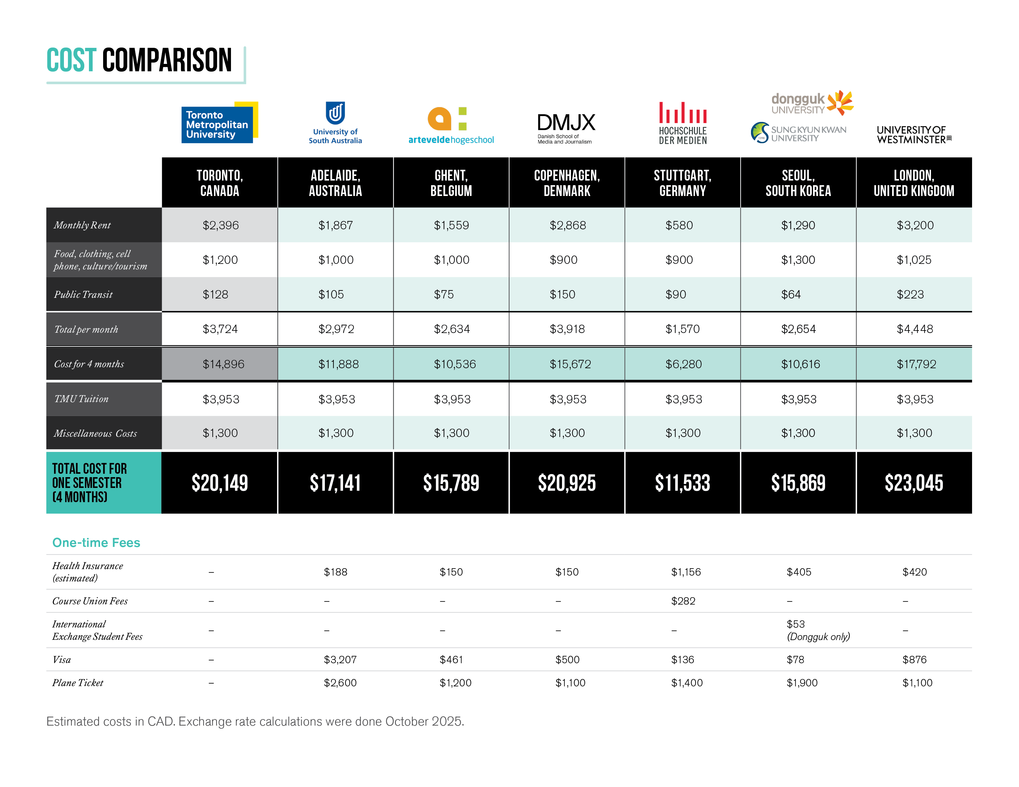 Cost of living varies from location to location. It is important to educate yourself on the approximate cost of living in each city that you apply to for exchange. Before a student applies for the exchange semester, they should have a firm grasp of the costs involved in going abroad, as well as the approximate budget required for their time studying in their chosen country. This factor can play a part in where you decide to apply for your exchange semester. The cost comparison chart on this page acts as an excellent starting point for your research, but it is up to you to stay up to date with the fluctuation of costs.