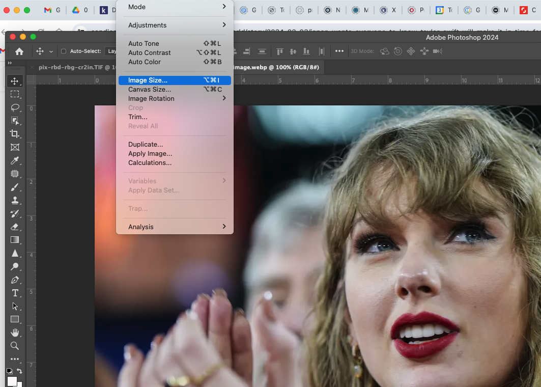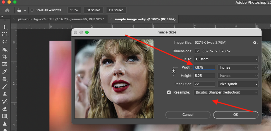 Image of Photoshop. When readjusting the image size you can change the width, height, and resolution of the original image as well as resampling. The image is 72 ppi as this is an image designed for web usage. Changing the resolution from 72 to 300 doesn't help, it will make a high resolution poor quality image, it won't 'look' good when actually printed.