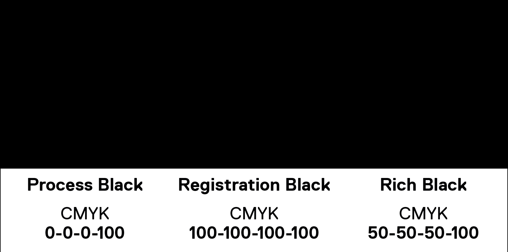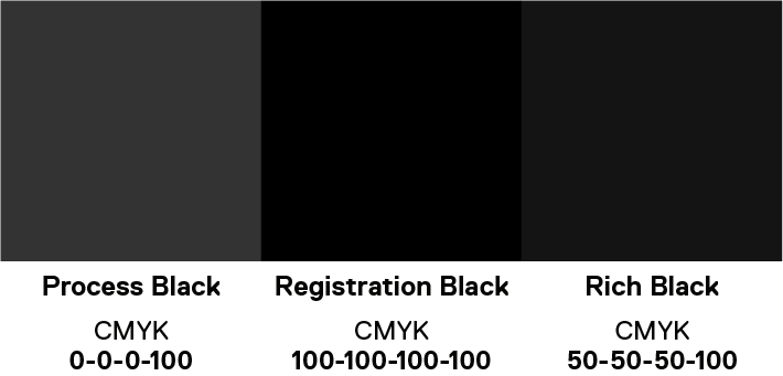 True Black, Process Black, Registration Black, and Rich Black are all pictured in a row, labelled with their respective RGB and CMYK values. They are all reproduced in RGB. They are nearly indistinguishable.