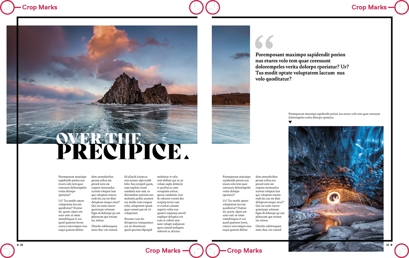 Crop marks, also known as trim marks are added to a design before printing, and are the indication of where the final cut is. They are lines or ticks printed in the corners of a sheet or sheets of paper to show where the job needs to be trimmed.