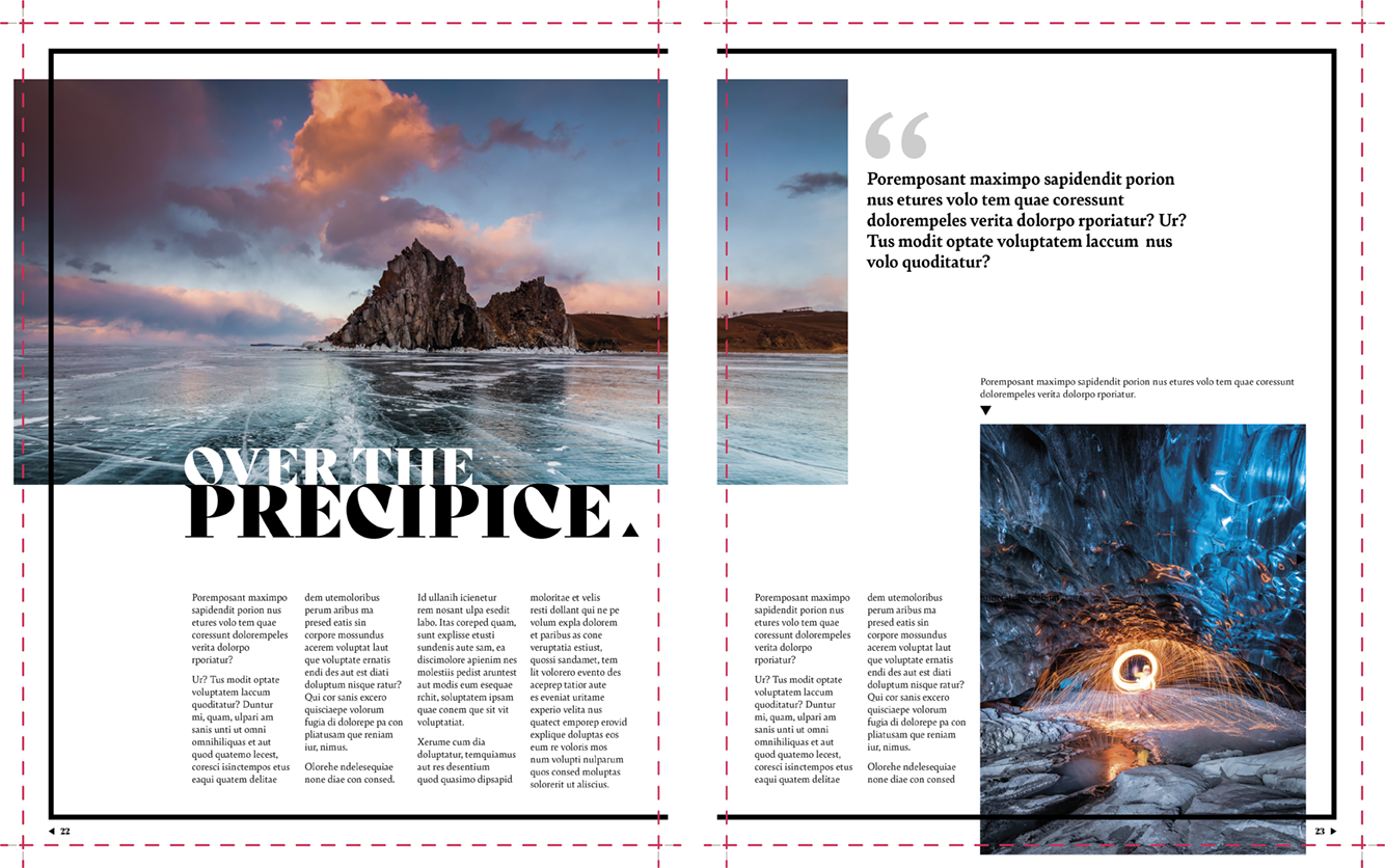 Layout of a magazine with highlighted lines showing where each cut is going to be made across the entire sheet.