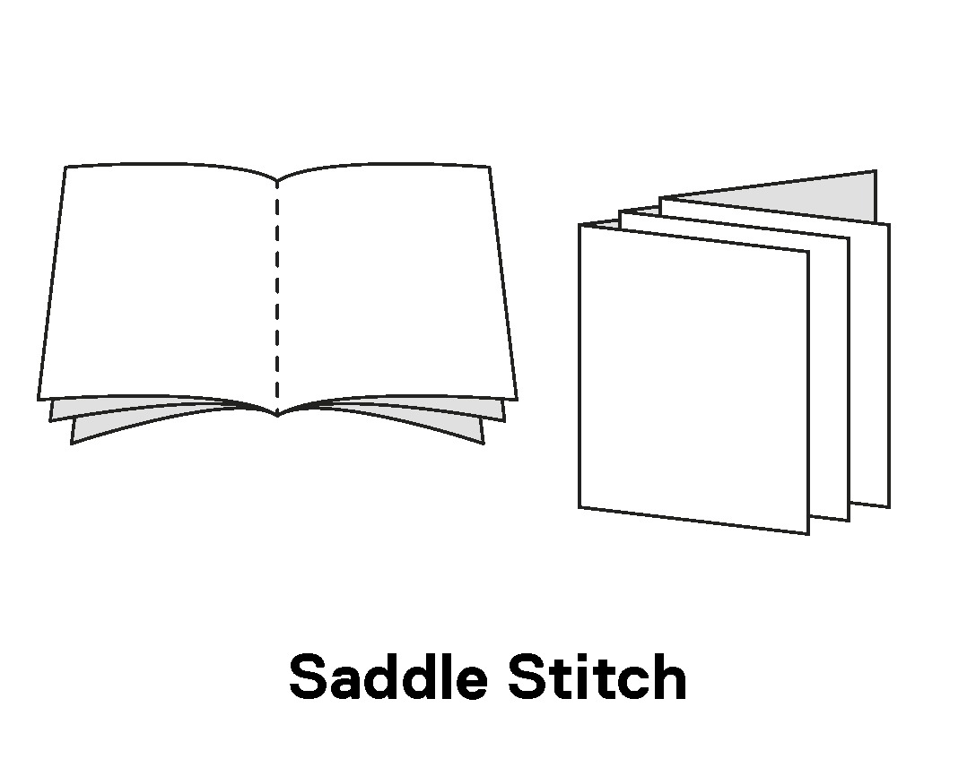 An image demonstrating how pages are collated for saddle stitch binding. The sheets are folded, gathered, and bound together down the fold-line, pictured as a dotted line along the middle.