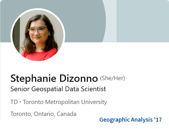 On the occasion of the upcoming Open House (opens in new window) event on Saturday, March 16, 2024, we reconnected with a dozen Geographic Analysis (opens in new window) alumni and obtained their permission to profile their careers here. From graduating classes between 2005 and 2018, these alumni have reached a variety of program-related senior analyst, director, and manager positions as well as unique jobs as commercial airline pilot or entrepreneur in the VR gaming industry. Employers include Canadian Tire, CIBC, City of Toronto, Deloitte, Freedom Mobile, Loblaw, Manulife, Rexall, TD Bank, and the 407 Express Toll Route. Through its graduates, the Geographic Analysis (opens in new window) program makes significant and meaningful contributions to the economy of the Greater Toronto Area and beyond.