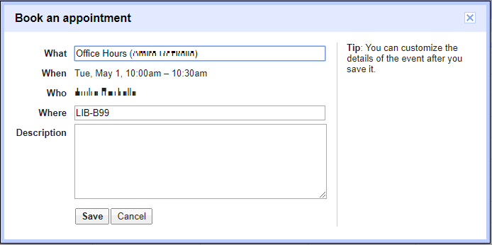 4. Click and drag to create a regular appointment spanning the total length of that particular office hour session. An input box appears as shown in the Figure 1. Note that in this example we’re setting up a block of office hours lasting three hours.