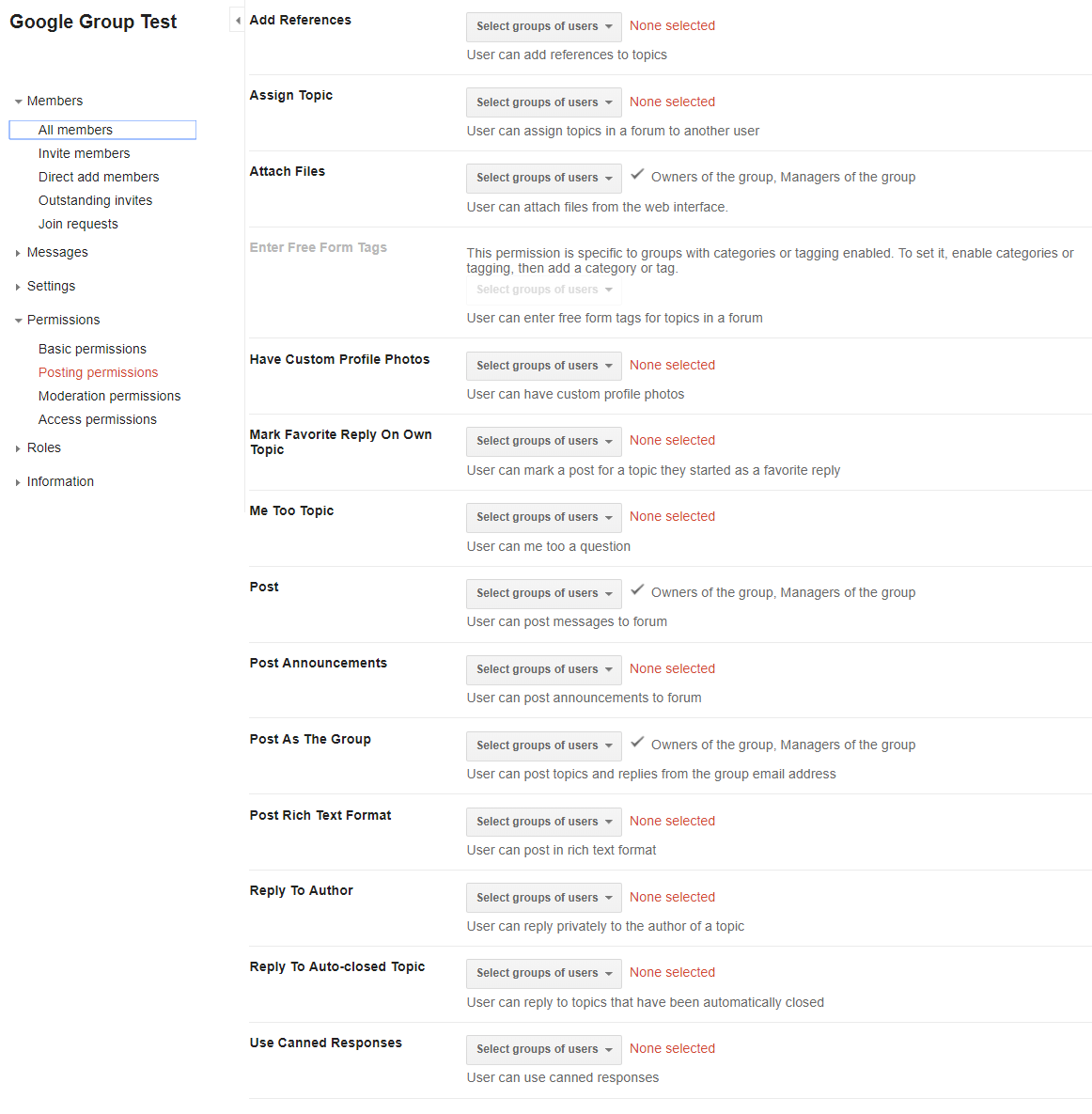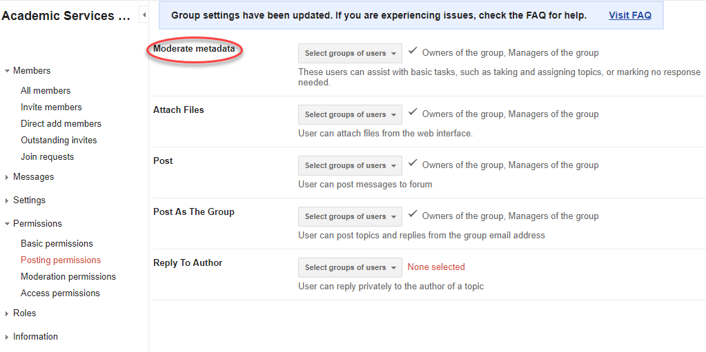 Groups settings with similar functions will be merged to three new settings: Manage Members, Moderate Content and Moderate Metadata. The merged settings can be assigned to a user in the Google Groups list; moreover, individual permissions that have been merged cannot be assigned to users.