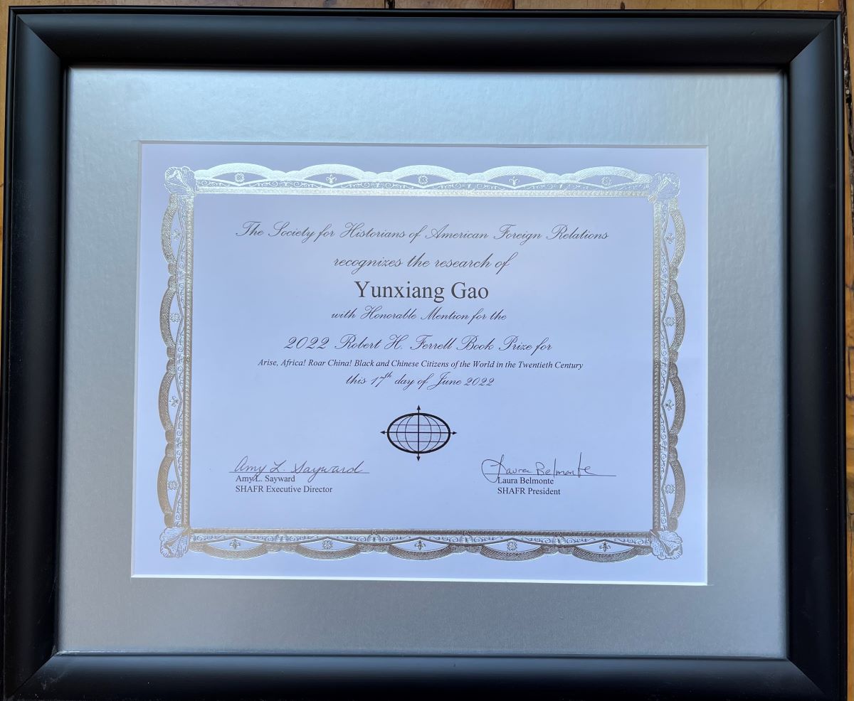 Robert H. Ferrell Book Prize of the Society for Historians of American Foreign Relations (SHAFR) is designed to reward distinguished scholarship in the history of American foreign relations, broadly defined. The prize committee "were profoundly impressed... [and] dazzled by the creative approach Gao took to documenting and contextualizing the many different kinds of connections that existed between W.E.B. Du Bois, Paul Robeson, Langston Hughes, Liu Liangmo, and Sylvia Silan Chen. Gao's multi-lingual archival finds—in such diverse collections—reveal the potential of transnational history to tell enormous stories in exciting and revelatory ways. The careful work Gao do to attend to the complexity of her historical subjects while also helping the reader understand how these individuals shed light on much larger historical phenomena is visible on every page of the book. We all learned so much from reading this rich work of truly excellent scholarship."
