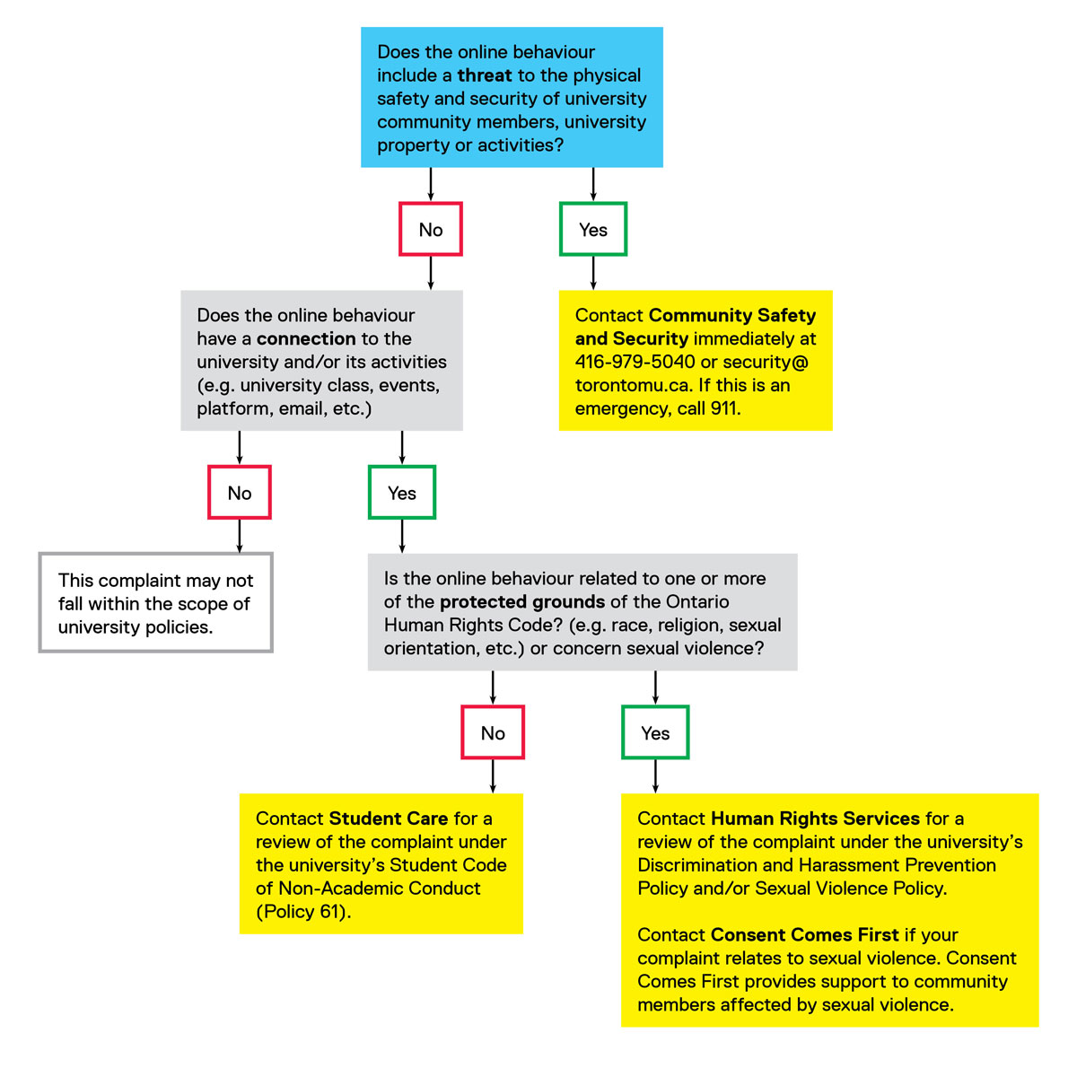 Concerns of online student behaviour are assessed on a case-by-case basis to determine whether or not the behaviour falls under university policies, each of which are handled by different offices within the university. Relevant policies include the Discrimination and Harassment Policy (Human Rights Services), Sexual Violence Policy (Human Rights Services) and/or (PDF file) Student Code of Non-Academic Conduct (Student Care).