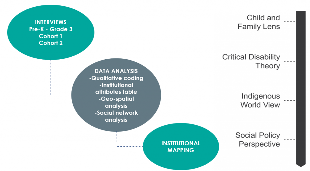 The IECSS project is a longitudinal study that conducts annual interviews with families of children who are accessing disability and developmental services. We interview family members once per year and ask them about the actions and work that they have done to access institutions on behalf of their children. Our methodological approaches produce empirical evidence of the ideology, processes, and social relations (Graheme, 1998) in early intervention, care and education for children with disabilities. We document the institution from the standpoint of families in order to understand the work that they do in relation to these institutions. We have multiple methods of analysis, including: