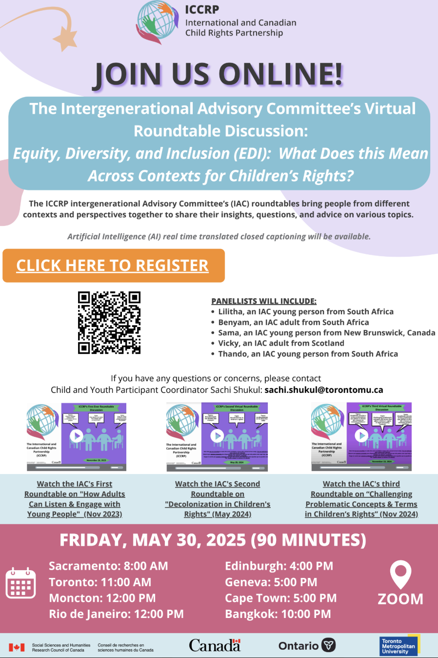 The ICCRP includes young people with lived experience, 40 researchers, and 30 partner organizations from universities, NGOs, major human rights institutions, and governments in Canada and in multiple countries across the Americas, Africa, Europe, Asia, and Oceania. The ICCRP’s work is guided by the expertise of an Intergenerational Advisory Committee and an international Steering Committee.