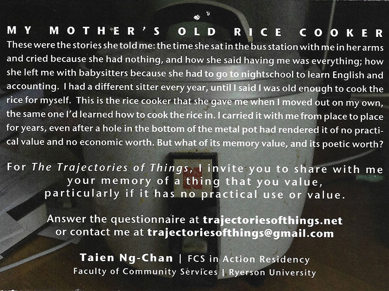 Hamilton-based artist Taien Ng-Chan, was the Faculty of Community Service’s first artist-in-residence. As a writer and media artist, Taien’s work melds cinema, poetry, cartography, objects, found and digital art to interrogate everyday urban life.