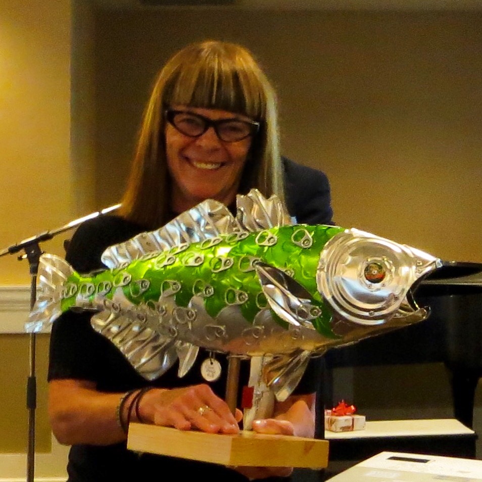 In 2015, Blatchford was inducted as a Ryerson School of Journalism Headliner, RSJ’s Hall of Fame. Though she could not attend the ceremony, she came to the afterparty. For her Headliner photo, she sent in a picture of her holding a fish sculpture that was given to her as a thank you for a speaking engagement. The fish sculpture looks great, though she is blurry.