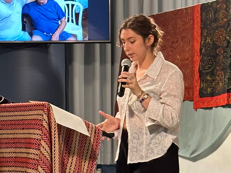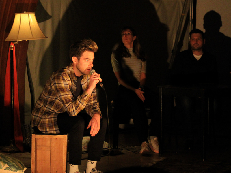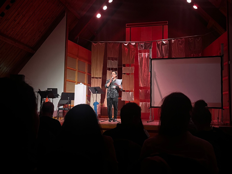 Amber Ranson performing her first live journalism piece, “All This Fuss Over Dirty Dishes?” on October 4, 2023 (photo courtesy of April Ranson)