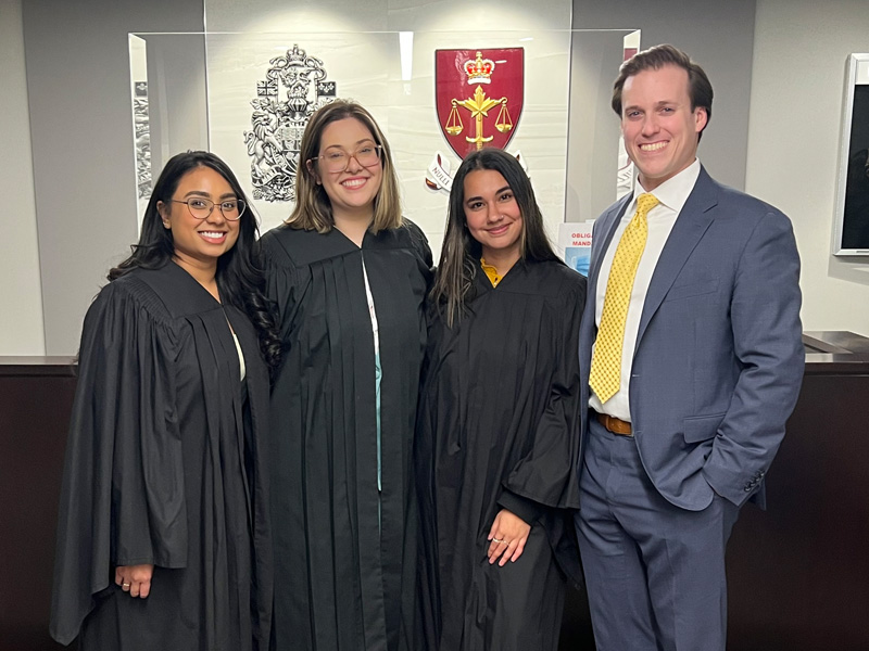 Lincoln Alexander Law students Andrea Arbuthnot, Justine Bedasse, Rosie Dhillon, and Shaun Shepherd traveled to Montréal, Quebec, to represent the school at the 2023 Canadian National Negotiation Competition (CNNC). The students negotiated in teams of two against students from across Canada. The CNNC teaches students negotiation skills through simulated legal negotiations.