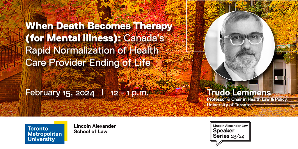 In this presentation, Professor Trudo Lemmens will explain how and why Canada’s MAiD practice has, in a very short period of time, gone beyond the most liberal euthanasia regimes in the world, in terms of numbers and scope of practice. He will discuss how the flawed rhetoric of a constitutional right to MAiD has contributed to an over-emphasis in law, professional guidance, and in practice, on the right to access death as therapy, rather than the right to protection against premature death. He will also reflect on what we can learn from how Canada’s law and health professional practice has embraced death as medical therapy.