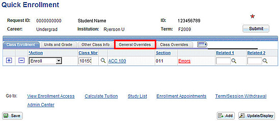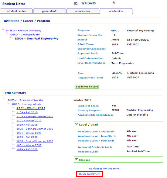 If a student is having problems enrolling in a class, you can use the Quick Enrolment link on the Academic tab of the Admin Center to address some of the issues.