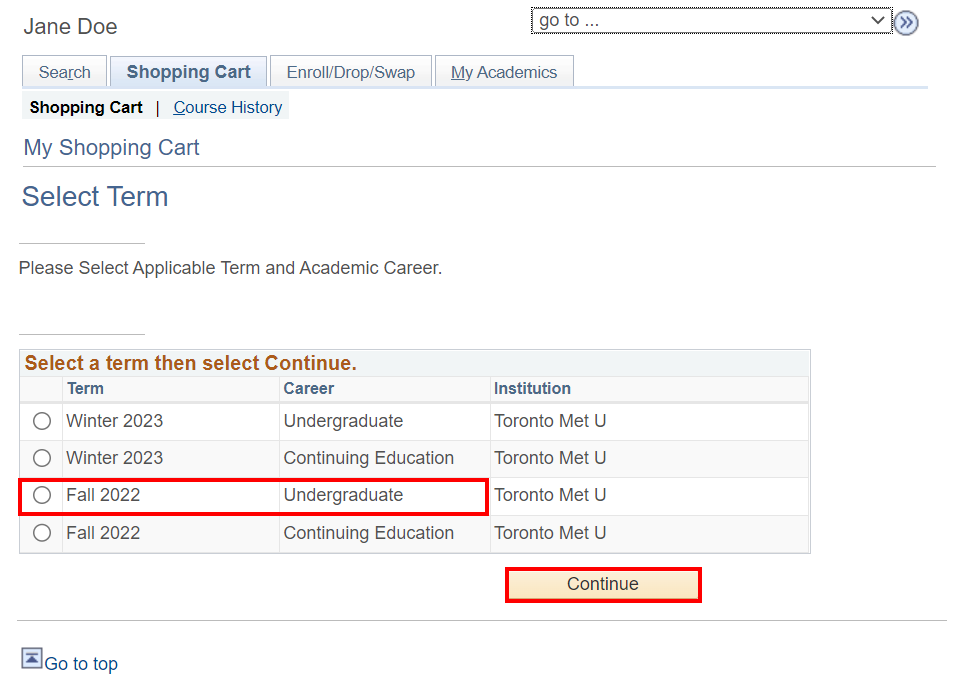 List of radio buttons within Shopping Cart to select Term and Career, and 'Continue' button highlighted