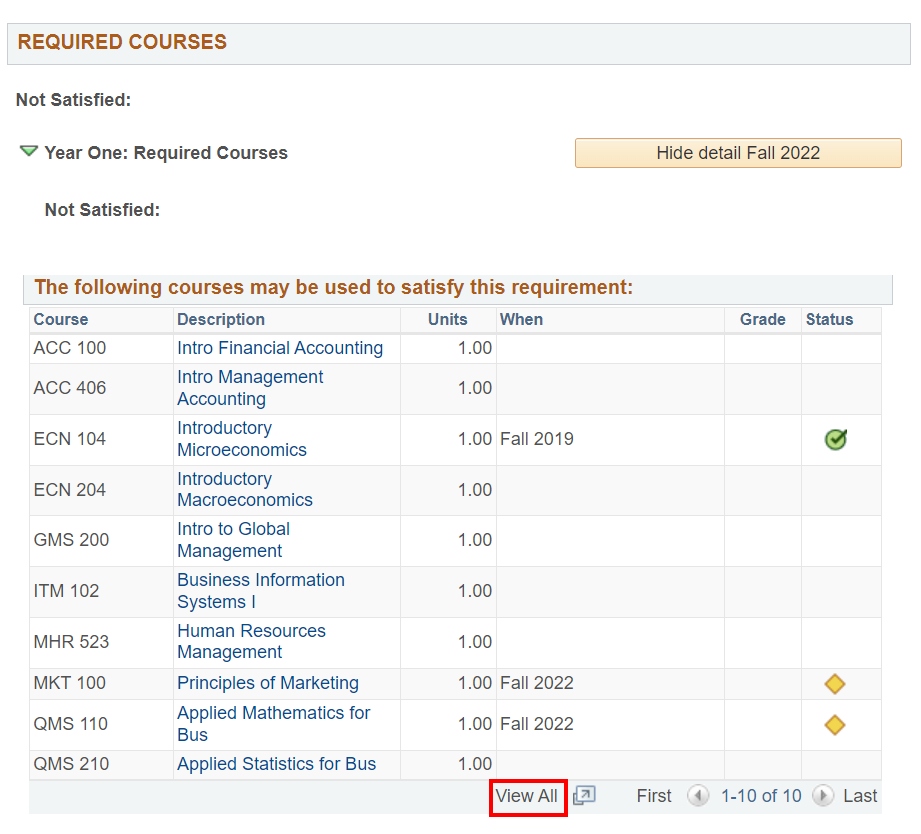 List of courses available to fulfill 'Year 1 Required Courses' requirements with 'View All' button highlighted